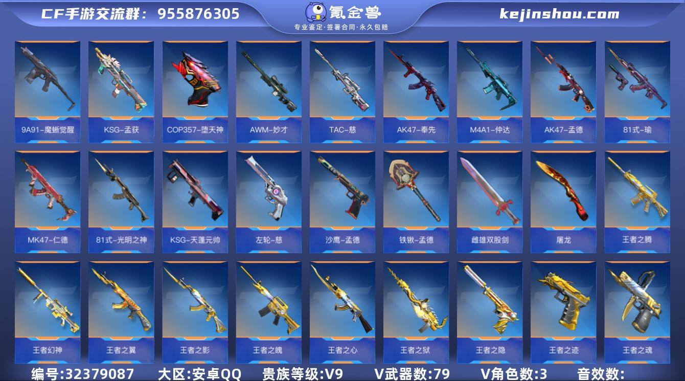 【FC-56ZKXM】【凤雏星象奉先多三国-7至尊3同框王怒带紫电5cop-子涵香香-238赏金币-最终消灭无双-差4115到v10】安卓QQ,成人号:是,角色等级:166,实名:有修改人脸机会/实名是本人,段位:枪王S,VIP等级:V9,V武器数量:435,V角色数量:15,V总数量:273,王者武器数:20,万化数量:511,音效皮肤数:6, 【人物角色】子涵,瞳,潜龙队,香香,樱,幽灵刀锋,大老师,堕天使,孤狼,复仇者,葵,铁骑,萝拉,夏日灵狐,春节兰,圣诞灵狐,魅惑灵狐,幻影,斯沃特,零-新生,秦师,刀锋-枪战王者,祝融夫人,炽天使-X,武媚,云悠悠-心动起点,木兰,蜀雪,月神,雅典娜,救世主-X,妲姬,麻雀,职场灵狐,职场灵狐-赛事经理,斯薇特, 【王者武器】王者之尊,M12S-雷霆王者,王者之蝶,王者之心,王者之影,王者之翼,王者之魄,王者之戮,王者之怒,王者之魂,王者之灵,王者之轮,王者之锋,王者之啸,王者之击,王者之烈,王者之圣,王者之迹,王者之神,王者之狱, 【至尊套装】影至尊,翼至尊,戮至尊,怒至尊,心至尊,魄至尊,烈至尊, 【带V枪械】尼泊尔-星象,龙啸,巴雷特-毁灭,尼泊尔-火麒麟,激昂霸王枪,地狱烈炎,双持尼泊尔-变色龙,M4A1-心动次元觉醒,马来剑-毁灭,麒麟刺,柯尔特-仲达,SCAR-幽暗骑士觉醒,SCAR-探星者,M4A1-运输船,屠龙,AK47-Rush-星速,M4A1-Rush-夜袭,AWM-天使,神罚战斧,M4A1-海骑士,M4A1-赛博雷神,QBB95-极光,9A91-天神,M4A1-雷霆,血月,M4A1-仲达,GM6-战争风云觉醒,M4A1-龙血,M1216-血月,QBZ03-死神,M4A1-威侯,VEPR12-宙斯,M4A1-星象,M4A1-武圣,M4A1-君威GS,激光短刃-黑骑士,斩神刀,QCW05-变形金刚·大黄蜂,AK47-破空冰刃,M4A1-玫瑰精灵,M14EBR-拂影,M4A1-死神,M4A1-黑龙,太白诗仙扇,M4A1-黑骑士,烈焰弓,M4A1-雷神,打击者-天神,47-仁德,AK...
