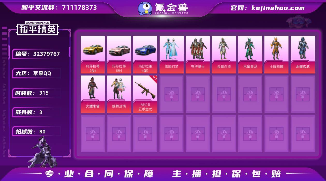 8粉装 2特效枪 3载具实名: 可修改 时装数: 315 载具数: 3 枪械数: 80 战备数: 52 热门装扮: 蝶舞迷情,守护骑士,火曜朱雀,水曜玄武,土曜战麒,木曜青龙,金曜白虎,雪国幻梦 载具: 玛莎拉蒂Ghibli(金),玛莎拉蒂Ghibli(蓝),玛莎拉蒂Ghibli(粉) 稀有枪皮: M416五爪金龙,Kar98K-巳巳如意