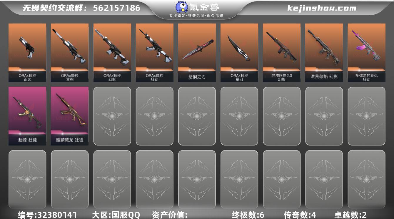 【套装】:创·纪元套装 【英雄】:幻棱,炼狱,维斯,暮蝶,钛狐,壹决,铁臂,捷风,雷兹,幽影,不死鸟,贤者,猎枭,蝰蛇,零,芮娜,奇乐,尚勃勒,霓虹,斯凯,夜露,星礈,K/O,海神,盖可,黑梦,钢锁 【近战武器】:近战武器-碎心裂刃,近战武器-镭切,近战武器-神罚 军刀,近战武器-诡秘蛇影 军刀,近战武器-神圣领域 战刀,近战武器-星际猎兵 短剑 【狂徒】:狂徒-塑水宗,狂徒-创·纪元,狂徒-虚空遗器,狂徒-光荣异象,狂徒-堕天遗武,狂徒-紫阙金琅,狂徒-离子武器//2.0,狂徒-诡秘蛇影 【幻影】:幻影-洪荒怒焰,幻影-电音光谱,幻影-混沌序曲//2.0,幻影-神圣领域,幻影-末日之翼,幻影-电音光谱 【戍卫】:戍卫-破败军械,戍卫-月球哨兵,戍卫-折光棱晶 【獠犬】:獠犬-781-A协议,獠犬-神圣领域 【冥驹】:冥驹-星云暗涌 【飞将】:飞将-末日之翼 【莽侠】:莽侠-创·纪元,莽侠-诡秘蛇影,莽侠-月球哨兵 【战神】:战神-神圣领域 【奥丁】:奥丁-末日之翼 【判官】:判官-诡秘蛇影 【雄鹿】:雄鹿-紫阙金琅//2.0,雄鹿-月球哨兵 【骇灵】:骇灵-创·纪元,骇灵-星云暗涌 【蜂刺】:蜂刺-星云暗涌,蜂刺-折光棱晶 【标配】:标配-折光棱晶 【VCT手枪】:标配-VC...