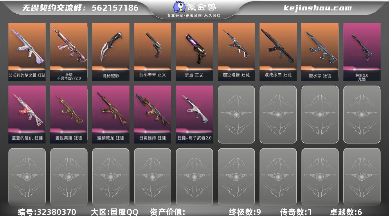 【特价出售·性价比账号】 【套装】:虚空遗器套装 【英雄】:幻棱,炼狱,维斯,暮蝶,钛狐,壹决,铁臂,捷风,雷兹,幽影,不死鸟,贤者,猎枭,蝰蛇,零,芮娜,奇乐,尚勃勒,霓虹,斯凯,夜露,星礈,K/O,海神,盖可,黑梦,钢锁 【近战武器】:近战武器-碎心裂刃,近战武器-剥皮小刀,近战武器-RGX 11z Pro//3.0 爪刀,近战武器-澄湖潋滟,近战武器-源始幻刃,近战武器-机动狂飙 战刀,近战武器-诡秘蛇影 军刀,近战武器-神圣领域 战刀,近战武器-日耀风暴 遗器,近战武器-阿特拉斯指挥部 甩棍,近战武器-星际猎兵 短剑 【狂徒】:狂徒-全息波普//2.0,狂徒-创·纪元,狂徒-虚空遗器,狂徒-盖亚的复仇,狂徒-离子武器//2.0,狂徒-诡秘蛇影 【幻影】:幻影-虚空遗器,幻影-侦察力量,幻影-神圣领域,幻影-末日之翼 【戍卫】:戍卫-归零者//2.0,戍卫-月球哨兵,戍卫-折光棱晶 【獠犬】:獠犬-神圣领域 【冥驹】:冥驹-偃月苍龙,冥驹-星云暗涌 【飞将】:飞将-西部未来,飞将-末日之翼 【莽侠】:莽侠-神中神罚,莽侠-诡秘蛇影,莽侠-月球哨兵 【战神】:战神-神圣领域 【奥丁】:奥丁-末日之翼 【判官】:判官-虚空遗器,判官-诡秘蛇影 【雄鹿】:雄鹿-月球哨兵 【骇灵...