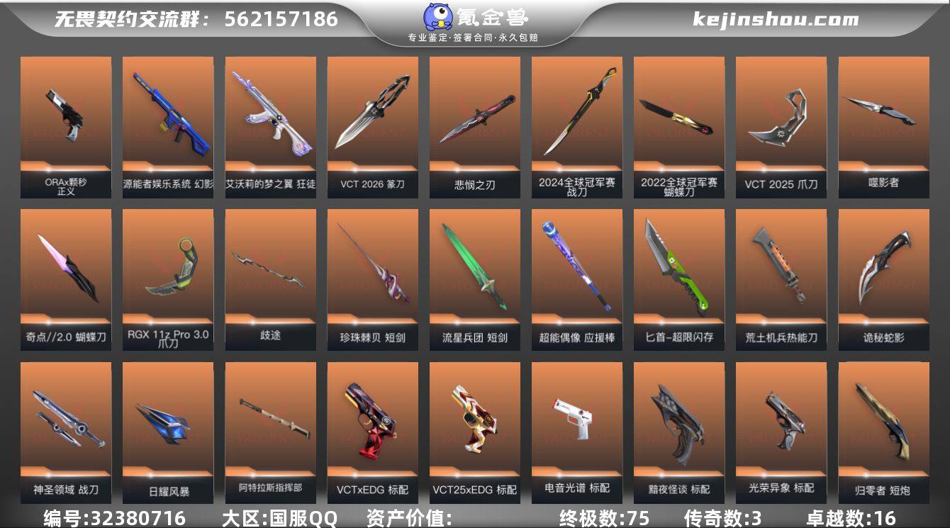 【套装】:《双城之战》收藏套装,混沌序曲套装,创·纪元套装,RGX 11z Pro//2.0套装,VCT 2025 赛季套装,噬影者套装,RGX 11z Pro套装,艾沃莉的梦之翼套装,上古龙炎套装,超时空卫队套装,千灵华绽套装,光明哨兵套装,黯夜怪谈套装,毁灭骑士套装,般若假面//2.0套装,掠影套装,黑市套装,日冕雄师套装,英雄之选套装,咒缚双界套装,离子武器//2.0套装,手工达人套装,星航勇进 【英雄】:幻棱,炼狱,维斯,暮蝶,钛狐,壹决,铁臂,捷风,雷兹,幽影,不死鸟,贤者,猎枭,蝰蛇,零,芮娜,奇乐,尚勃勒,霓虹,斯凯,夜露,星礈,K/O,海神,盖可,黑梦,钢锁 【近战 武器】:近战武器-RGX 11z Pro//3.0 爪刀,近战武器-VCT 2025 爪刀,近战武器-RGX 11z Pro//2.0 蝴蝶刀,近战武器-穿花蝴蝶,近战武器-RGX 11z Pro 战刀,近战武器-超时空卫队 三棱军刺,近战武器-黑波之刃,近战武器-落英飞旋,近战武器-噬影者 簇刃,近战武器-镭切,近战武器-艾沃莉的魔法棒,近战武器-鬼丸国纲,近战武器-离子武器//2.0 爪刀,近战武器-埃芒迪尔大剑,近战武器-双城之战 拳套,近战武器-龙爪,近战武器-混沌大剑,近战武器-超限闪存 匕首,近战武器-定海神珍,近战武器-盖亚之愠,近战武器-荒土机兵 热能刀,近战武器-毁灭战斧,近战武器-街机高手,近战武器-圣石遗物,近战武器-手工达人 战斧,近战武器-天界荣光,近战武器-夜刃诡镰,近战武器-影刃,近战武器-诡秘蛇影 军刀,近战武器-神圣领域 战刀 【狂徒】:狂徒-艾沃莉的梦之翼,狂徒-上古龙炎,狂徒-超时空卫队,狂徒-光明哨兵,狂徒-混沌序曲,狂徒-双城之战,狂徒-偃月苍龙,狂徒-创·纪元,狂徒-噬影者,狂徒-RGX 11z Pro,狂徒-般若假面//2.0,狂徒-冰点凝冻,狂徒-堕天遗武,狂徒-掠影,狂徒-盖世英雄,狂徒-黑市,狂徒-日冕雄师,狂徒-咒缚双界,狂徒-...