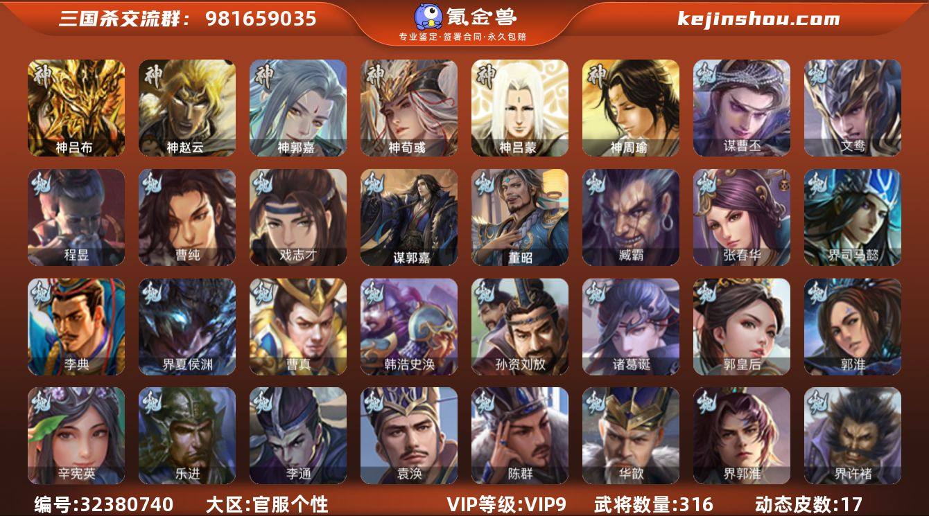 官阶:骠骑将军;VIP等级:VIP9;史诗武将数量:33;动态皮肤数量:17;武将总数:316;史诗宝珠数量:0;将魂数量:11986;神将:4;魏国史诗武将:10;蜀国史诗武将:6;吴国史诗武将:8;群史诗武将:13
