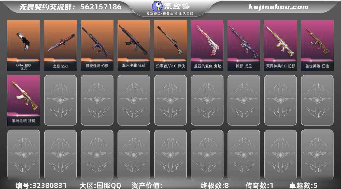【编号 22611 可秒换绑】店长推荐特价处理精品号【套装】:VCT 2025 赛季套装,耀鳞威龙套装 【英雄】:幻棱,炼狱,维斯,暮蝶,钛狐,壹决,铁臂,捷风,雷兹,幽影,不死鸟,贤者,猎枭,蝰蛇,零,芮娜,奇乐,尚勃勒,霓虹,斯凯,夜露,星礈,K/O,海神,盖可,黑梦,钢锁 【近战 武器】:近战武器-紫金爪刀,近战武器-VCT 2025 爪刀,近战武器-奇点 军刀,近战武器-威龙之刃,近战武器-夜刃诡镰,近战武器-诡秘蛇影 军刀,近战武器-神圣领域 战刀 【狂徒】:狂徒-塑水宗,狂徒-虚空遗器,狂徒-RGX 11z Pro,狂徒-盖亚的复仇,狂徒-耀鳞威龙,狂徒-诡秘蛇影 【幻影】:幻影-奇点,幻影-神圣领域,幻影-战术小伙伴,幻影-末日之翼 【戍卫】:戍卫-钢轨卫士,戍卫-月球哨兵,戍卫-折光棱晶 【獠犬】:獠犬-神圣领域,獠犬-战术小伙伴 【冥驹】:冥驹-混沌序曲,冥驹-偃月苍龙,冥驹-星云暗涌 【飞将】:飞将-光导纤维,飞将-末日之翼 【莽侠】:莽侠-诡秘蛇影,莽侠-月球哨兵 【战神】:战神-神圣领域 【奥丁】:奥丁-战术小伙伴,奥丁-末日之翼 【判官】:判官-诡秘蛇影 【雄鹿】:雄鹿-月球哨兵 【骇灵】:骇灵-奇点,骇灵-光导纤维,骇灵-星云暗涌 【蜂刺】:蜂刺-战术小伙伴,蜂刺-星云暗涌,蜂刺-折光棱晶 【标配】:标配-光导纤维,标配-折光棱晶 【VCT手枪】:标配-VCT25 x BLG 【正义】:正义-西部未来,正义-纳米打击,正义-月球哨兵 【鬼魅】:鬼魅-耀鳞威龙,鬼魅-诡秘蛇影,鬼魅-星云暗涌 【狂怒】:狂怒-钢轨卫士,狂怒-神圣领域 【短炮】:短炮-钢轨卫士,短炮-末日之翼 【卡面】:终章:激斗汉堡 卡面,进入射程 卡面,《双城之战》拥抱 卡面,精灵大战 卡面,欢迎来到底城 卡面,南瓜盛典 卡面,修车达人 卡面,正义的化身 卡面,时间到 卡面,最高舞台 卡面,声感陷阱设计图 卡面,梦幻奶茶...