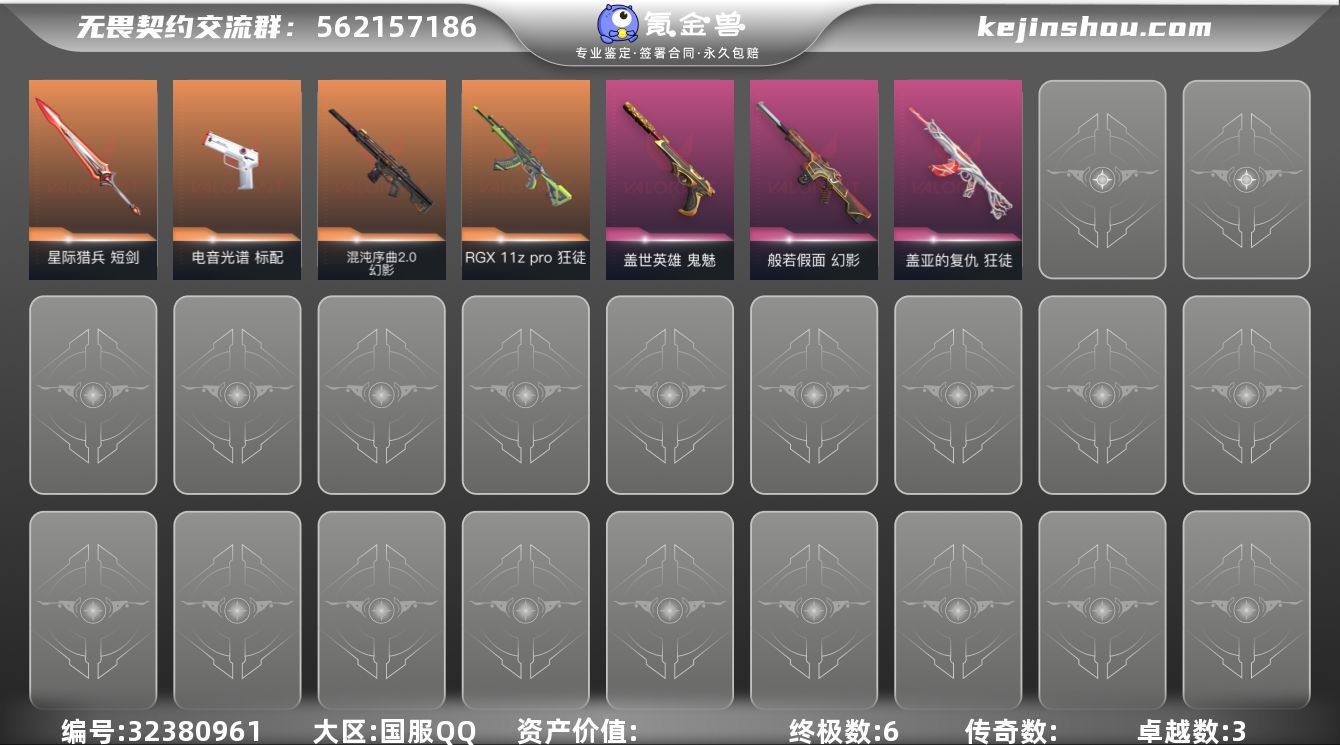 L2038 【精品号】恶鬼幻影 光谱标配 显卡狂徒 大圣鬼魅 紫金爪刀 盖亚狂徒 混沌幻影库存:11520 剩余VP:98 剩余R点:85 段位:铂金3