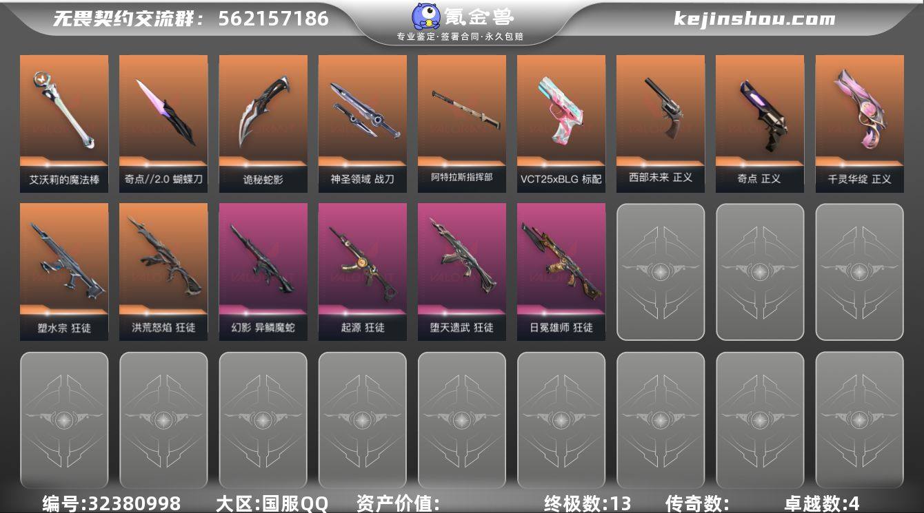 L2677 【性价比】魔法棒 奇点正义 黑波之刃 流脓狂徒 西部正义 堕天狂徒 vct25blg标配 魔蛇幻影 塑水狂徒 奇点蝴蝶刀 莲花正义 日冕狂徒 起源狂徒库存: 25340剩余VP:22剩余R点:130 段位:白银