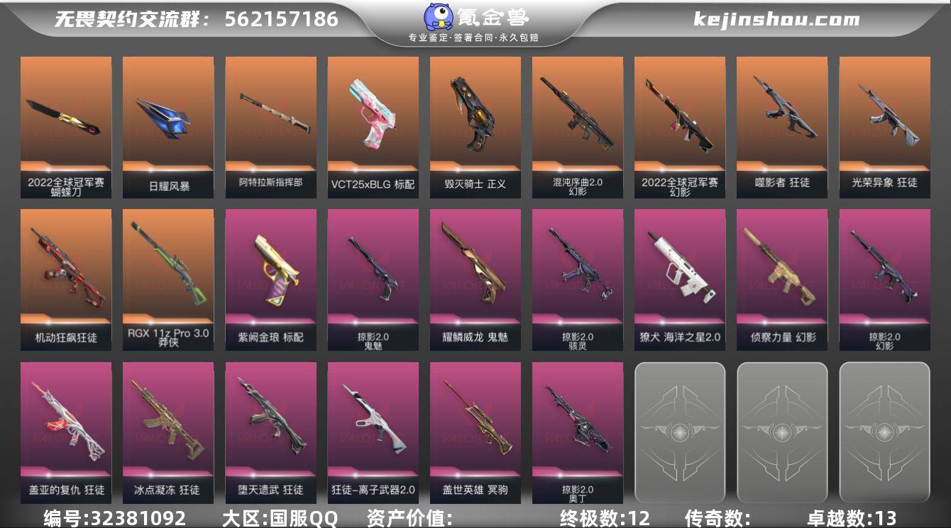 XSQY14【游戏等级】Lv169 【段位】 钻石II 【R点】1,090 【皮肤总价值】40,630 【英雄数量】28 【皮肤数量】90 【挂饰数量】86 【卡面数量】114 【喷漆数量】108 【短炮】短炮-好搭档 短炮-末日之翼 短炮-纤云弄巧 短炮-深海水族 【标配】标配-星际猎兵 标配-阿特拉斯指挥部 标配-折光棱晶 标配-VCT25xBLG 标配-荒土机兵 标配-超能偶像 标配-战术熊与伙伴们 【莽侠】莽侠-诡秘蛇影 莽侠-月球哨兵 莽侠-纤云弄巧 莽侠-深海水族 【奥丁】奥丁-末日之翼 奥丁-纳米打击 奥丁-流星兵团 奥丁-天界神兵//2.0 【狂徒】狂徒-诡秘蛇影 狂徒-虚空遗器 狂徒-偃月苍龙 狂徒-海洋之星 狂徒-荒土机兵 狂徒-掠影 狂徒-流星兵团 狂徒-盖亚的复仇 狂徒-塑水宗 狂徒-洪荒怒焰 狂徒-冰点凝冻 【戍卫】戍卫-折光棱晶 戍卫-月球哨兵 戍卫-逆冲蛮牛 戍卫-天界神兵 戍卫-战术熊与伙伴们 戍卫-珍珠棘贝 【飞将】飞将-末日之翼 飞将-战术熊与伙伴们 【蜂刺】蜂刺-折光棱晶 蜂刺-星云暗涌 蜂刺-纤云弄巧 蜂刺-深海水族 【判官】判官-诡秘蛇影 判官-纳米打击 判官-天界神兵//2.0 【近战武器】近战武器-神圣领域战刀 近战武器-荒土机兵热能刀 近战武器-鬼丸国纲 近战武器-RGX11zPro//3.0爪刀 近战武器-流星兵团短剑 近战武器-珍珠棘贝短剑 近战武器-天御刀 【鬼魅】鬼魅-星云暗涌 鬼魅-流星兵团 鬼魅-破败军械 【冥驹】冥驹-星云暗涌 冥驹-荒土机兵 冥驹-堕天遗武 冥驹-复古浪潮 【幻影】幻影-侦察力量 幻影-神圣领域 幻影-781-A协议 幻影-纳米打击 幻影-珍珠棘贝 幻影-天界神兵//2.0 【獠犬】獠犬-神圣领域 獠犬-全息波普 獠犬-逆冲蛮牛 獠犬-复古浪潮 【骇灵】骇灵-星云暗涌 骇灵-荒土机兵 骇灵-流星兵团 骇灵-珍珠棘贝 【雄鹿】雄鹿-月球哨兵 雄鹿-逆冲蛮牛 雄鹿-复古浪潮 【战神】战神-神圣领域 战神-深海水族 【狂怒】狂怒-神圣领域 狂怒-...