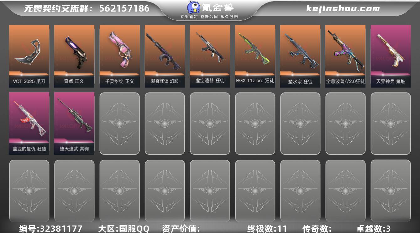 【编号90264可秒换绑】店长推荐精品号【英雄】:炼狱,维斯,暮蝶,壹决,捷风,不死鸟,贤者,猎枭,蝰蛇,夜露 【近战 武器】:近战武器-紫金爪刀,近战武器-RGX 11z Pro//3.0 爪刀,近战武器-鬼丸国纲,近战武器-超限闪存 匕首,近战武器-光圈记忆 弹簧刀,近战武器-荒土机兵 热能刀,近战武器-琉璃锻梦剑,近战武器-诡秘蛇影 军刀,近战武器-神圣领域 战刀 【狂徒】:狂徒-光明哨兵,狂徒-洪荒怒焰,狂徒-混沌序曲,狂徒-塑水宗,狂徒-虚空遗器,狂徒-掠影,狂徒-盖亚的复仇,狂徒-耀鳞威龙,狂徒-紫阙金琅,狂徒-荒土机兵,狂徒-诡秘蛇影 【幻影】:幻影-黯夜怪谈,幻影-侦察力量,幻影-超限闪存,幻影-神圣领域,幻影-纳米打击,幻影-末日之翼 【戍卫】:戍卫-破败军械,戍卫-浮光跃金,戍卫-逆冲蛮牛,戍卫-月球哨兵,戍卫-折光棱晶 【獠犬】:獠犬-源能者娱乐系统,獠犬-神圣领域,獠犬-模拟赫兹,獠犬-逆冲蛮牛 【冥驹】:冥驹-光明哨兵,冥驹-堕天遗武,冥驹-荒土机兵,冥驹-模拟赫兹,冥驹-星云暗涌 【飞将】:飞将-末日之翼 【莽侠】:莽侠-创·纪元,莽侠-超限闪存,莽侠-诡秘蛇影,莽侠-月球哨兵 【战神】:战神-神圣领域,战神-浮光跃金 【奥丁】:奥丁-纳米打...