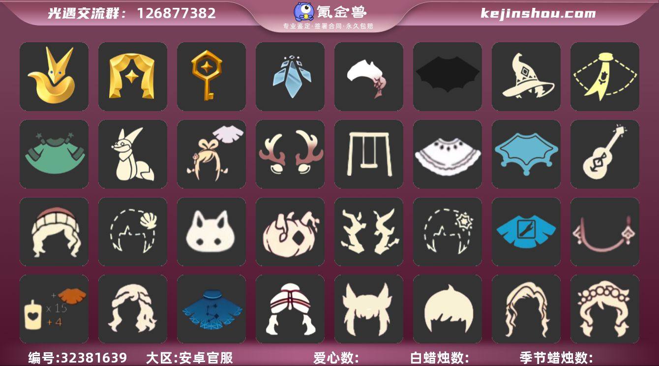 账号类型: 手机账号 季节已毕业: 小王子季,表演季,筑巢季 完成地图: 晨岛,雨林,霞谷,暮土 珍稀物品: 白枭,玫瑰花 礼包: 蝙蝠套,巫师,围巾,星球斗,小狐狸,绊爱,鹿角,秋千,白绒金,瑞雪,吉他,彩虹帽,贝壳,兔子,南瓜,枯角,雪花,tgc,新年耳钉,创始人,海蓝波浪发型,线框斗,蛛网朋克,锦标赛晶翼斗篷礼包 裤子: 武士裤,背带裤,白棉裤 面具: 黄鼠狼,红狐狸 面饰: 红耳机 发型: 正太,公主头,虚荣,白枭 头饰: 花环 斗篷: 白金 配饰: 高音钢琴,笛子,乐器
