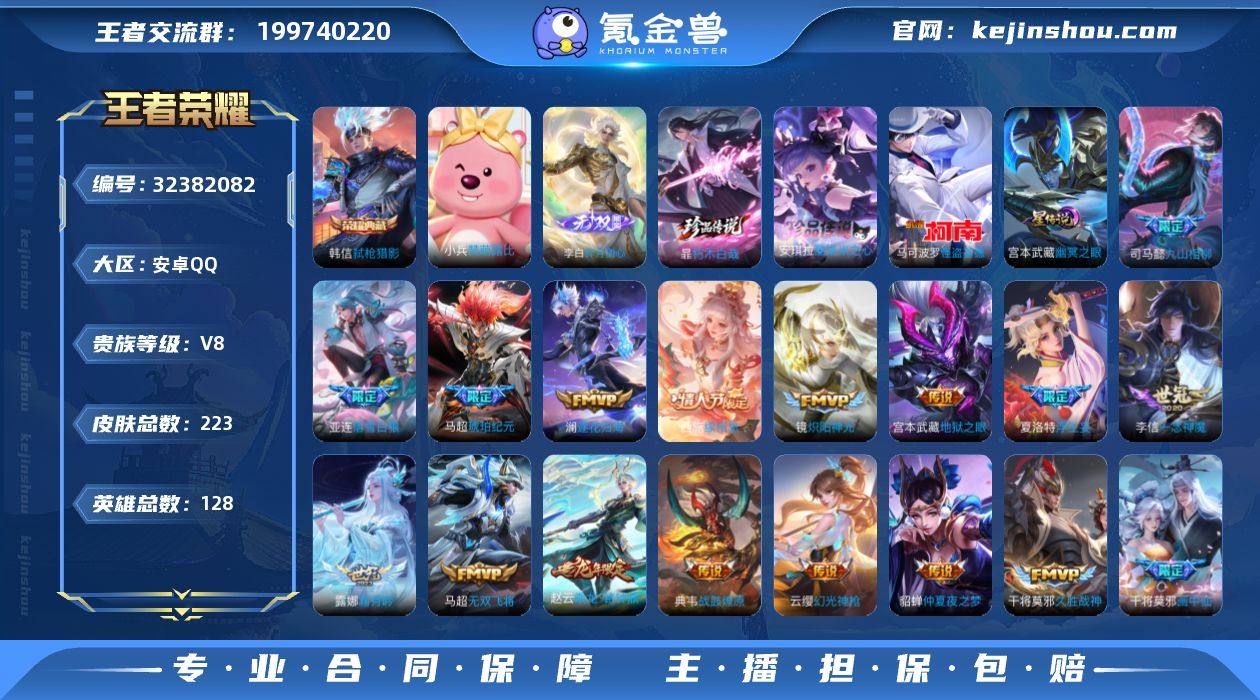 精品女号 安卓Q-V8-最强王者段位-128英雄-251皮肤-1典藏皮肤-1无双-6珍品传说-19传说-61史诗【英雄全皮】:孙权全皮,苍全皮,敖隐全皮,空空儿全皮,影全皮【荣耀典藏】:韩信弑枪猎影【无双皮肤】:公孙离离恨烟【珍品传说】:瑶大耳狗之梦,张飞兔狲蓬尾,嫦娥器灵落星盏,孙策时之奇旅,鲁班七号江户川柯南,马可波罗怪盗基德【传说皮肤】:云缨神骥越千峰,马超神骥逐星野,王昭君长夜焕生,后羿神树通天,干将莫邪千山共赴,公孙离云诺千山,虞姬愿照岁时盈,云缨幻光神枪,桑启鸣野蒿,澜逐花归海,大乔时之奇旅,百里守约碎云,铠绛天战甲,虞姬启明星使,干将莫邪久胜战神,百里玄策白虎志,花木兰冠军飞将,孙尚香末日机甲,宫本武藏地狱之眼【限定皮肤】:公孙离离恨烟,暃埋骨钱,蒙犽顽岩魄,蔡文姬夏日便利店,大乔绒语心约,虞姬夏日便利店,姜子牙天穹之誓,狄仁杰阴阳师,赵云皇家上将,妲己时之彼端,元歌云间偶戏,元歌无心,马可波罗暗影游猎,狄仁杰魔术师,达摩沙漠行僧,项羽海滩派对,虞姬启明星使,杨戬潮玩骑兵,干将莫邪冰霜恋舞曲,干将莫邪胡桃夹子,鬼谷子原初探秘者,大乔时之奇旅,百里玄策白虎志,百里玄策原初追逐者,沈梦溪大漠名商,明...
