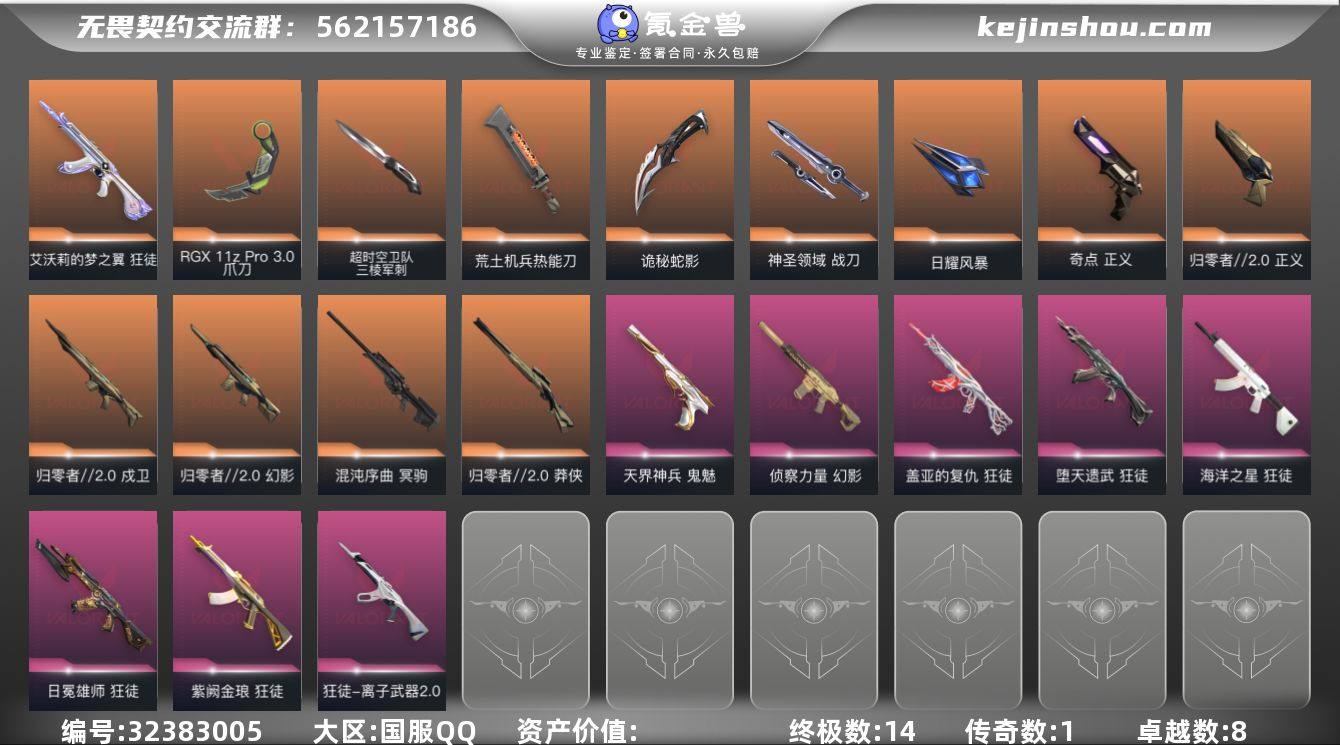 【套装】:归零者//2.0套装 【英雄】:幻棱,炼狱,维斯,暮蝶,钛狐,壹决,铁臂,捷风,雷兹,幽影,不死鸟,贤者,猎枭,蝰蛇,零,芮娜,奇乐,尚勃勒,霓虹,斯凯,夜露,星礈,K/O,海神,盖可,黑梦,钢锁 【近战武器】:近战武器-超时空卫队 三棱军刺,近战武器-RGX 11z Pro//3.0 爪刀,近战武器-鬼丸国纲,近战武器-荒土机兵 热能刀,近战武器-生物分子解离器,近战武器-诡秘蛇影 军刀,近战武器-神圣领域 战刀,近战武器-日耀风暴 遗器 【狂徒】:狂徒-艾沃莉的梦之翼,狂徒-堕天遗武,狂徒-盖亚的复仇,狂徒-海洋之星,狂徒-日冕雄师,狂徒-紫阙金琅,狂徒-离子武器//2.0,狂徒-荒土机兵,狂徒-诡秘蛇影 【幻影】:幻影-归零者//2.0,幻影-侦察力量,幻影-神圣领域,幻影-纳米打击,幻影-末日之翼 【戍卫】:戍卫-归零者//2.0,戍卫-逆冲蛮牛,戍卫-月球哨兵,戍卫-折光棱晶 【獠犬】:獠犬-神圣领域,獠犬-逆冲蛮牛 【冥驹】:冥驹-混沌序曲,冥驹-荒土机兵,冥驹-星云暗涌 【飞将】:飞将-末日之翼 【莽侠】:莽侠-归零者//2.0,莽侠-诡秘蛇影,莽侠-月球哨兵 【战神】:战神-神圣领域 【奥丁】:奥丁-纳米打击,奥丁-末日之翼 【判官】:判官-诡秘蛇影,判官-纳...
