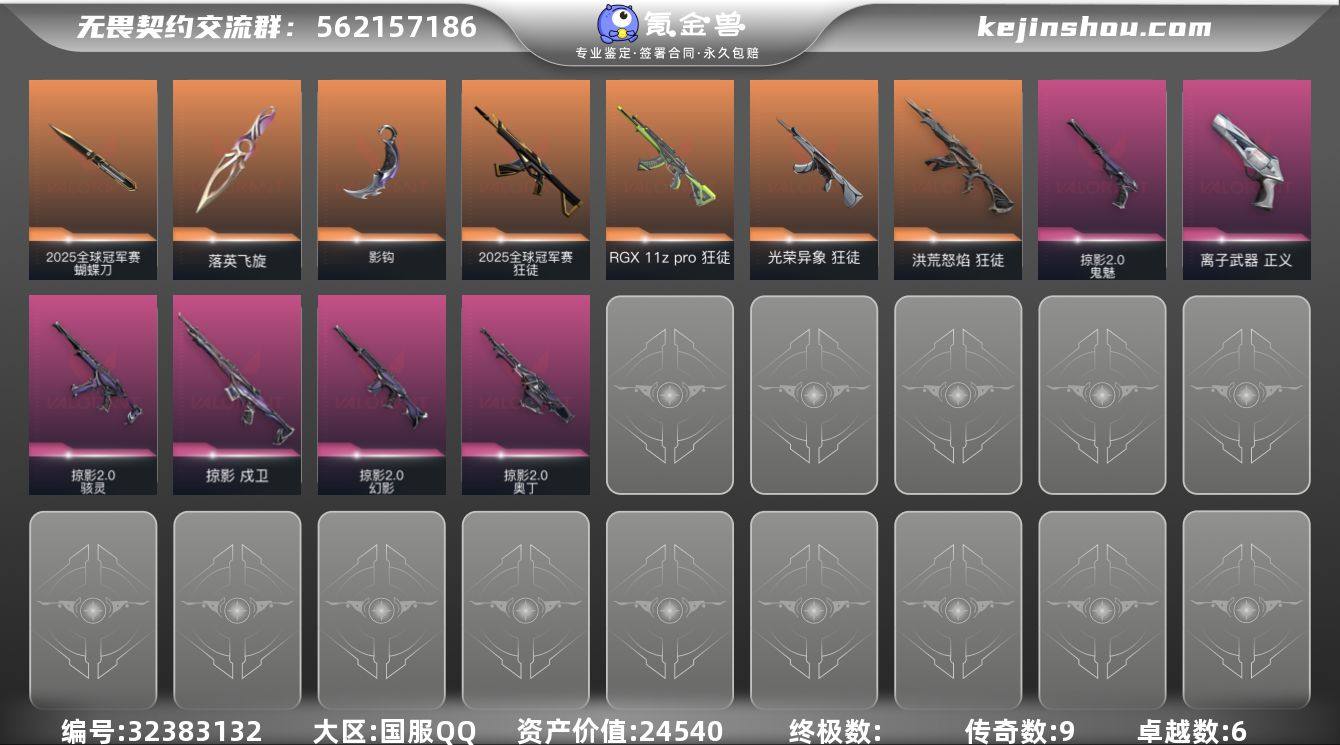 【自带包赔 可赔三倍】:库存价值24540 限定25冠军套+掠夺2.0套装 性价比超值小库存号 入手无忧 找回包赔 【限定】: 2025全球冠军赛 狂徒, 2025全球冠军赛 蝴蝶刀 【近战】: 2025全球冠军赛 蝴蝶刀, 影钩, 落英飞旋 【狂徒】: RGX 11z Pro 狂徒, 洪荒怒焰 狂徒, 2025全球冠军赛 狂徒, 光荣异象 狂徒 【幻影】: 掠影//2.0 幻影 【正义】: 离子武器 正义 【戍卫】: 掠影 戍卫 【鬼魅】: 掠影//2.0 鬼魅 【骇灵】: 掠影//2.0 骇灵 【奥丁】: 掠影//2.0 奥丁【概要】: 总皮肤 42 终极 0 传奇 9 卓越 6 刀皮 英雄 28 LV 99 历史最高:钻石 当前段位:铂金三 已使用 635 R点 剩余 155 R点 可二次 卡面、挂饰、其他皮肤请看截图 道具、段位等以实际验号为准。如账号因没有维护,赛季更新等不可抗因素发生变化,不属于账号质量问题"