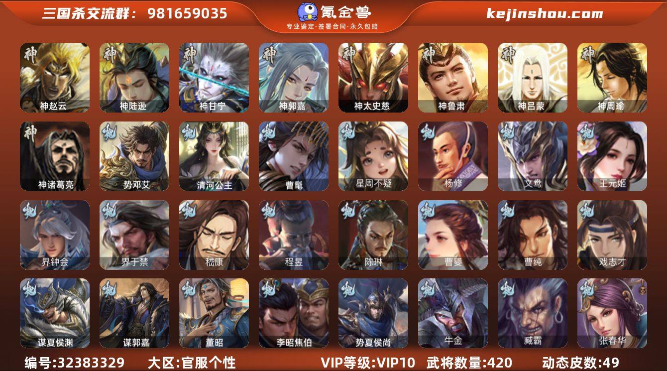 官阶:大将军;VIP等级:VIP10;史诗武将数量:57;动态皮肤数量:49;武将总数:420;史诗宝珠数量:39;将魂数量:8089;神将:7;魏国史诗武将:28;蜀国史诗武将:9;吴国史诗武将:10;群史诗武将:20