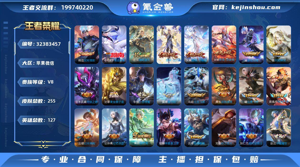 【店长推荐·弑枪猎影·马可波罗怪盗基德·愿照山河定·愿照千秋盛·祥瑞亨通·战鼓燎原·乘龙淬吴钩·霜月吟·记忆之芯·乞巧织情·镜炽阳神光·可二次】YXw17265-苹果WX-127英雄-255皮肤-6王者印记-150铭文-贵族积分5w【贵族8】【1典藏·1珍品·24传说·25按键】【因赛季更新游戏段付以上号为准!】 【英雄全皮】:苍全皮,司空震全皮 【荣耀典藏】:韩信弑枪猎影 【珍品传说】:马可波罗怪盗基德 【传说皮肤】:后羿神树通天,司空震愿照山河定,女娲愿照千秋盛,云缨幻光神枪,裴擒虎祥瑞亨通,桑启鸣野蒿,典韦战鼓燎原,孙策乘龙淬吴钩,澜逐花归海,露娜霜月吟,公孙离记忆之芯,吕布怒海麟威,马超无双飞将,赵云淬星耀世,王昭君乞巧织情,镜炽阳神光,虞姬启明星使,曜云鹰飞将,李信一念神魔,刘备时之恋人,达摩黄金狮子座,貂蝉仲夏夜之梦,宫本武藏地狱之眼,狄仁杰超时空战士 【限定皮肤】:暃埋骨钱,蒙犽顽岩魄,蔡文姬夏日便利店,大乔绒语心约,虞姬夏日便利店,姜子牙天穹之誓,李白谪仙醉月,狄仁杰阴阳师,赵云皇家上将,赵云龙胆,孙尚香蔷薇恋人,芈月幻夜卜梦,马可波罗山海玄木吟,狄仁杰魔术师,项羽海滩派对,孙悟空至尊宝,虞姬启明星使,裴擒虎李小龙,瑶山海碧...
