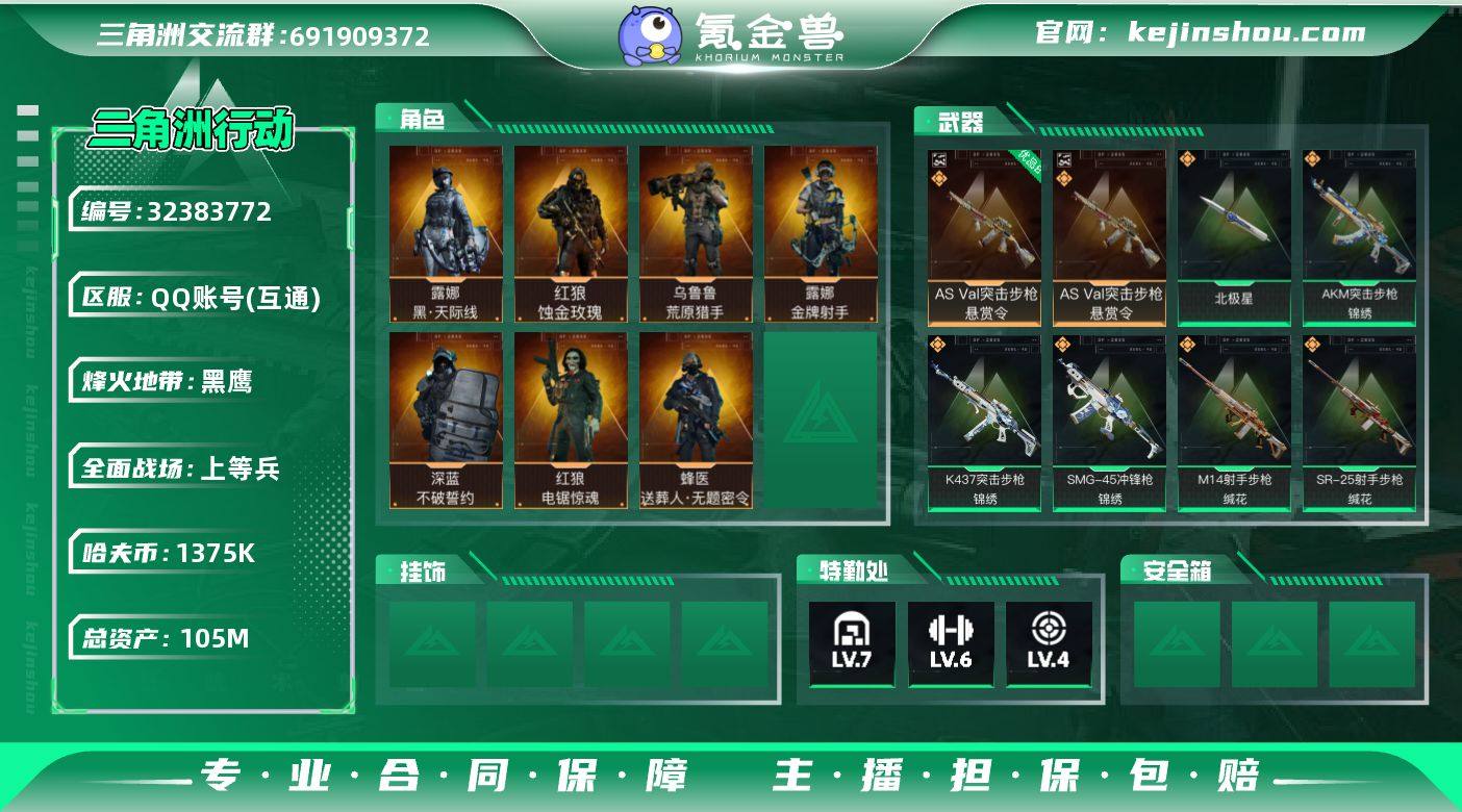 【SJZQH1198】总资产(M):105M/哈夫币(K):1375K/哈夫币(K):1375K/传说枪皮数:35/全面战场等级:37_段位:上等兵/烽火地带等级:60_段位:黑鹰/红狼-蚀金玫瑰/露娜-黑·天际线/蜂医-送葬人·无题密令(S5)/深蓝-不破誓约(S6)/红狼-电锯惊魂/露娜-金牌射手(S7)/乌鲁鲁-荒原猎手/近战-北极星/近战-黑鹰/AS Val突击步枪-悬赏令/优品B典藏武器外观-AS Val突击步枪-悬赏令/M4A1突击步枪-黑暗力量/M4A1突击步枪-蚀金玫瑰/M4A1突击步枪-阿米娅/AKM突击步枪-零度协议/AKM突击步枪-锦绣/ASh-12战斗步枪-鹅鸭杀/AUG突击步枪-悠然茶歇/SG552突击步枪-运动员/AK-12突击步枪-特斯拉线圈/SCAR-H战斗步枪-启航/G3战斗步枪-骑士/CAR-15突击步枪-阿米娅/腾龙突击步枪-捞点薯条/K437突击步枪-北极星/K437突击步枪-锦绣/KC17突击步枪-电锯惊魂/MK47突击步枪-悠然茶歇/UZI冲锋枪-特斯拉线圈/UZI冲锋枪-悠然茶歇/SMG-45冲锋枪-锦绣/SR-3M紧凑突击步枪-特斯拉线圈/勇士冲锋枪-能天使-午夜邮差/QCQ171冲锋枪-北极星/QCQ171冲锋枪-鹅鸭杀/725双管霰弹枪-送葬人-无题密令/M250通用机枪-骑士之心/QJB201轻机枪-鹅鸭杀/M14射手步枪-蛮荒/M14射手步枪-缄花/SR-25射手步枪-缄花/AWM狙击步枪-捞点薯条/.357左...