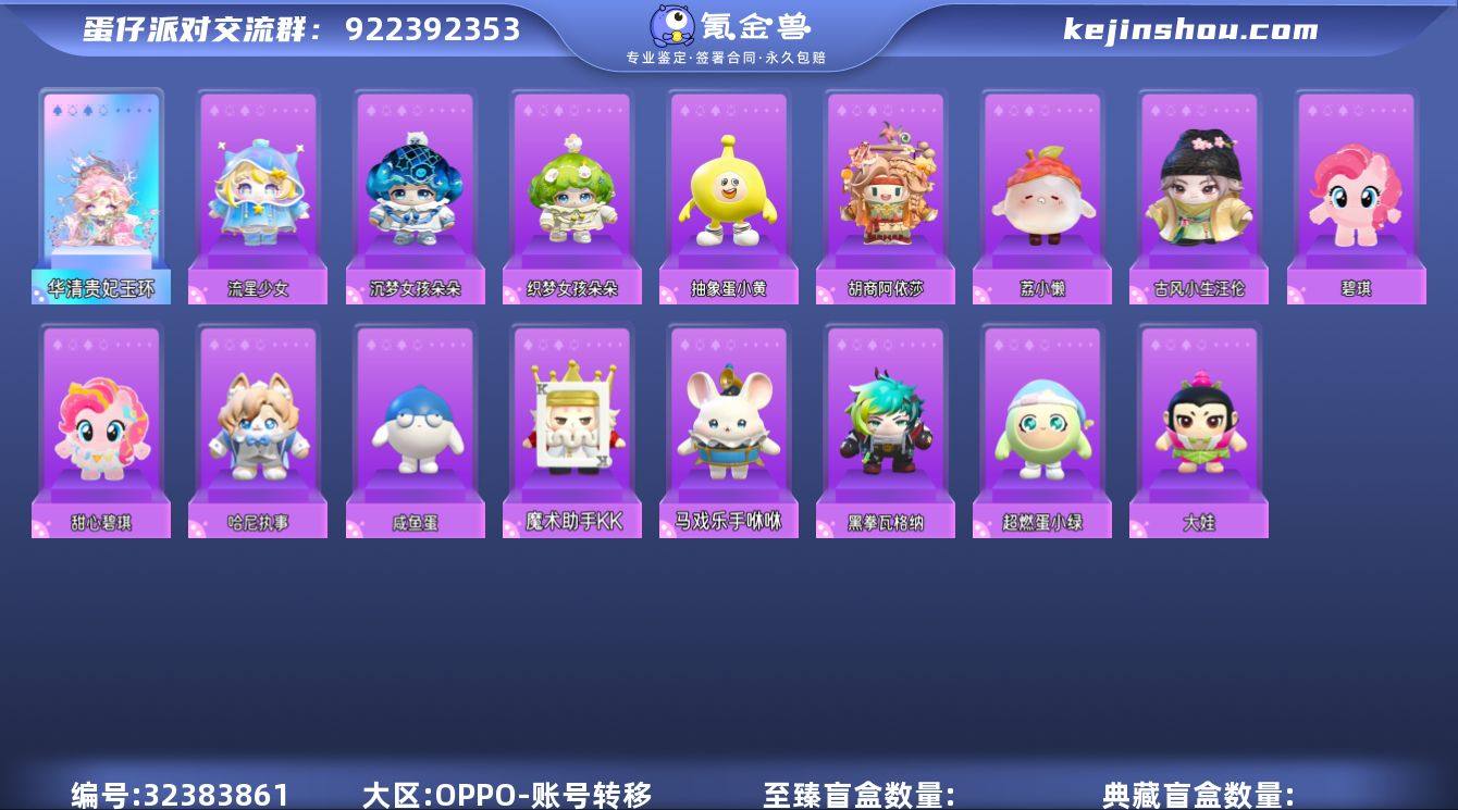 华清贵妃玉环 流星少女,沉梦女孩朵朵,织梦女孩朵朵,抽象蛋小黄,碧琪,古风小生汪伦,哈尼执事,胡商阿依莎,荔小懒,甜心碧琪,咸鱼蛋,魔术助手KK,马戏乐手咻咻,黑拳瓦格纳,超燃蛋小绿,大娃 段位:五阶鸵鸟蛋 卖家说:渠道服,道具玩具动作看图
