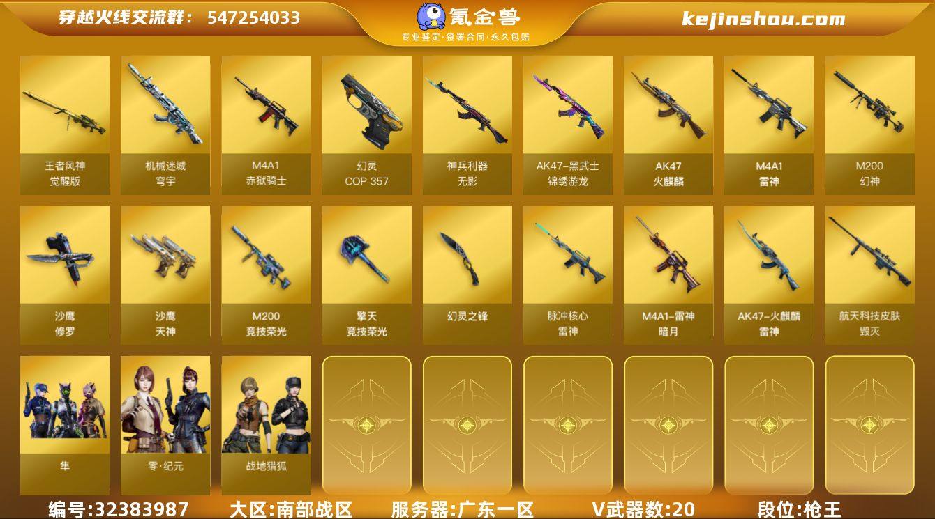 广东一区-23V-1王者武器数-0炫金武器数 【热门武器】:M200-幻神,M200-竞技荣光,COP 357-幻灵,沙鹰-修罗 【皮肤】:雷神-暗月,雷神-脉冲核心,雷神-源计划2.0专属 皮肤,火麒麟-雷神,毁灭-航天科技皮肤 【角色】:隼,零·纪元,战地猎狐,奇洋探员,乔伊教练,云海玲珑,暗夜-X,电竞少女,飞虎队-X,风暴女,娟娟,灵狐者-X,麻雀,曼陀罗-X,萌儿,潘多拉-X,潜龙队-X,青霞仙子,斯沃特-X,铁骑荣耀,维纳斯,新娜塔莎,雪莉杨,雪莉杨-摸金校尉,影武者-X,游珑儿 【人偶武器】:AWM-灵狐-15周年嘉年华*2,迷你裂空之翼*3,迷你生化手雷,生化手雷-机甲核心,灵狐娃娃手雷 【挑战大师】:神圣爆裂者III,冰龙粉碎者-白马银枪,激光毁灭者III-白马银枪,VEPR-12-金魔,激光毁灭者III,机甲撕裂者III,神圣爆裂者-末日III,阐释者III 【英雄级武器】:AK47-火麒麟,M4A1-雷神,无影-神兵利器,黑武士-锦绣游龙,机械迷城-穹宇,M200-幻神,M200-竞技荣光,王者风神-觉醒版,沙鹰-修罗,沙鹰-天神,COP 357-幻灵,幻灵之锋,擎天-竞技荣光,高爆手雷-幻灵*2,手雷-云海游龙,手雷-热带奇洋,闪光弹-幻灵,闪光弹-竞技荣光,烟雾弹-幻灵,烟雾弹-竞技荣光,M4A1-赤狱骑士...