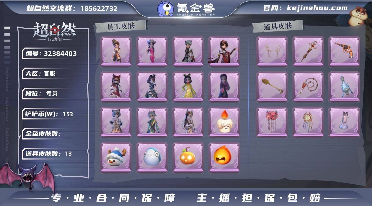 【Q1472】【段位】超自然传说 【幻梦皮肤数量】0 【星耀限定皮肤数量】0 【金色皮肤数量】1 【紫色皮肤数量】13 【道具皮肤数量】22 【铲铲币】1595w 【累充】3440金砖 【赛季魔盒】豪华魔盒 【员工】小黄、爱丽丝、零、阿念、逍遥、薇薇安、巫铃儿、莉莉、艾伦、爱德华、兰、小满、临云 【金色皮肤】巫铃儿-镜花辞 【紫色皮肤】艾伦-黎明猎手、爱德华-梵卓之礼、阿念-庆宴绮愿、爱丽丝-耀眼的你、薇薇安-仙锋小姐、爱丽丝-甜梦派对、莉莉-莓果陷阱、莉莉-除妖小师妹、阿念-王子与骑士、零-青云逸歌、爱丽丝-丝缕哀歌、逍遥-绣春逍影、小黄-呱呱雨衣 【道具皮肤】电击枪-权杖的许诺、转轮手枪-新星时代、传送按钮-逆时审判、长鞭-缚誓之锁、音响-鸣沙鼓、铲子-圣心之泪、夜视仪-敛花容、短管猎枪-星光的裁决、急救包-蔷薇物语、急救包-末章心跳、葫芦-海心凝珠、电击枪-甜蜜泡泡枪、专业手电-花束般的告白、刺刀-碧络琅环、铲子-赞萌波板糖、额外的背包-灵感泉之花、音响-月光奏鸣曲、闪光弹-金戈玄铜、背饰-白鼬趴趴、背饰-梵音莲华、背饰-毛球夹子 【头饰】饺饺者、马上有钱、烛光纪念、太空鲨头套、雪墩墩头套、蒜了八、惊魂南瓜头套、鱼头怪头套、烈焰红唇头套、大葱明头套、火爆了头套、面具马头套、哈士奇头套、萨卡班甲鱼头套、嘻嘻头套、滑稽头套、呆滞头套、卑微头套、炙热烧烤、像素朋克墨镜、后室幸存者头套 【挂饰】未竟乐园、天使消失的年代、糖果守卫 【动作】新年摇、一点点星星摇、luvaboy、鸳鸯戏、心跳摇、舞台中心、拜年、滑步舞、蝴蝶步、带你逃跑吧、律动迪斯科、举牌、抬手、KT猫摇