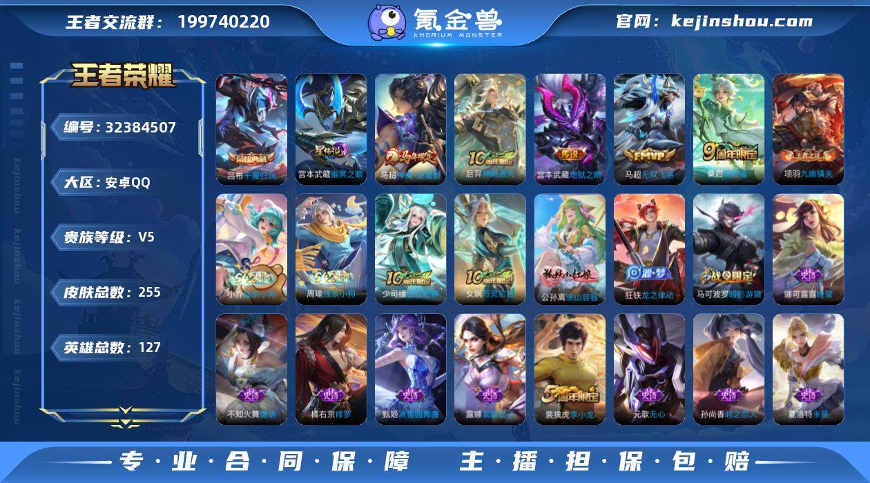 无二次-安卓Q-V7-最强王者段位-126英雄-156皮肤-1典藏皮肤-7传说-54史诗 【荣耀典藏】:孙悟空全息碎影 【传说皮肤】:云缨神骥越千峰,花木兰异界灵契,云缨幻光神枪,马超无双飞将,干将莫邪久胜战神,宫本武藏地狱之眼,狄仁杰超时空战士 【限定皮肤】:虞姬夏日便利店,姜子牙天穹之誓,杨戬破阵退雄兵,狄仁杰阴阳师,赵云皇家上将,墨子神迹守卫,元歌无心,狄仁杰魔术师,狄仁杰万华元夜,达摩沙漠行僧,项羽海滩派对,程咬金演武夺筹,兰陵王金庭之子,后羿圣弓游侠,李元芳云中旅人,钟馗驱傩正仪,杨玉环遇见飞天,干将莫邪胡桃夹子,雅典娜黎明之约,鬼谷子原初探秘者,鬼谷子五谷丰年,黄忠火炮绅士,苏烈千军破阵,百里玄策原初追逐者,梦奇顽趣,沈梦溪大漠名商,裴擒虎李小龙,云中君纤云弄巧,伽罗天狼溯光者,鲁班大师探海日志,桑启海盐诗旅,张良古海寻踪,蒙犽百解令,蒙恬荣光圣徽,高渐离燃音魔法,妲己灵卜魔法,鬼谷子天穹祈灯,鲁班七号蔬乡物语,李元芳蔬乡物语,刘邦剑破天穹,程咬金群星魔术团,镜青焰无极,项羽苍威无极,周瑜熔金海岸 【赛季限定】:鬼谷子原初探秘者,狄仁杰万华元夜,程咬金演武夺筹,钟馗驱傩正仪,苏烈千军破阵,达摩沙漠行僧,兰陵王金庭之子,沈梦溪大漠名商,李元芳云中旅人,桑启海盐诗旅,鲁班大师探海日志,张良古海寻踪,鬼谷子天穹祈灯,刘邦剑破天穹,姜子牙天穹之誓,钟馗虚灵犬护,亚瑟荣光之誓,百里玄策原初追逐者,雅典娜黎明之约,梦奇顽趣,蒙恬荣光圣徽 【战令限定】:墨子神迹守卫,后羿圣弓游侠,黄忠火炮绅士,高渐离燃音魔法,妲己灵卜魔法,鲁班七号蔬乡物语,李元芳蔬乡物语,镜青焰无极,项羽苍威无极,虞姬夏日便利店,亚连破空之剑,周瑜线条小狗,小乔线条小狗 【史诗皮肤】:钟馗锁墨魂,盘古撼世英歌,周瑜线条小狗,小乔线条小...