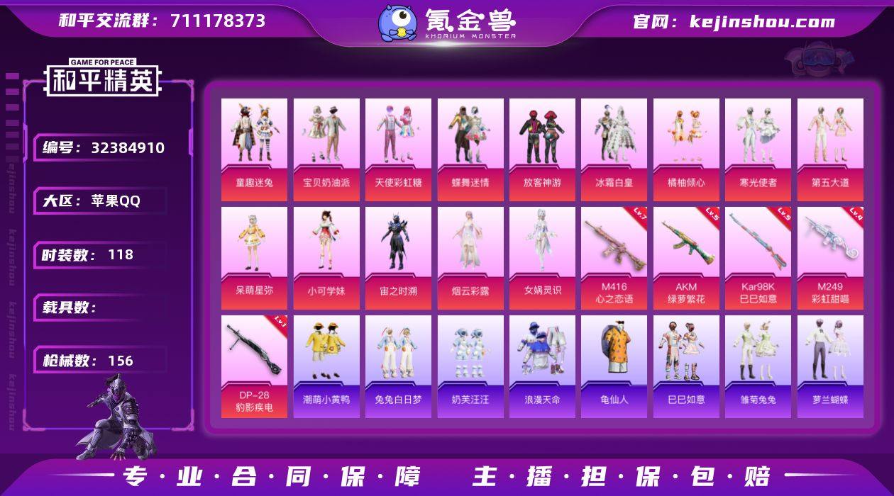 h9977【精品号】14粉5特 童趣迷兔 第五大道 放客神游 满级心之恋语 苹果 手Q-14粉装-5特效枪-0载具-1粉色飞行器-48692热力值-7王牌印记-118套装-156枪皮 【热门品类】:粉装-童趣迷兔,套装-浪漫天命,套装-龟仙人,套装-潮萌小黄鸭 【粉色套装】:粉装-宝贝奶油派,粉装-天使彩虹糖,粉装-蝶舞迷情,粉装-放客神游,粉装-冰霜白皇,粉装-童趣迷兔,粉装-橘柚倾心,粉装-寒光使者,粉装-第五大道,角色-呆萌星弥,角色-小可学妹,角色-宙之时溯,角色-烟云彩露,角色-女娲灵识 【粉色枪皮等级】:AKM-绿萝繁花(五级),M416-心之恋语(七级),Kar98K-巳巳如意(五级),M249-彩虹甜喵(四级),DP-28-豹影疾电(一级) 【粉色枪皮】:AKM-绿萝繁花,M416-心之恋语,Kar98K-巳巳如意,M249-彩虹甜喵,DP-28-豹影疾电 【粉色飞行器】:黄族统领飞行器 【粉色降落伞】:甜心宝贝降落伞,甜蜜誓约降落伞,彩虹甜喵降落伞,冰川粉黛降落伞,音爆索尼克降落伞,纯梦嫁纱降落伞,白勺歌姬降落伞,未来歌姬降落伞,炫光之旅降落伞,繁龙极客降落伞,江南烟雨降落伞,晶梦幻蝶降落伞,戏水时光降落伞 【稀有套装】:套装-龟仙人,套装-巳巳如意,套装-雏菊兔兔,套装-萝兰蝴蝶,角色-都市丽猫,...