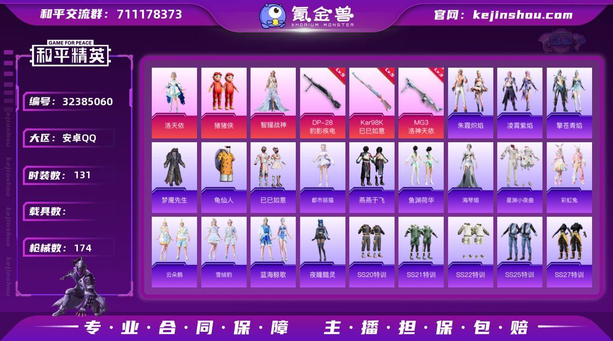 无二次-安卓 手Q-1粉装-5特效枪-0载具-1粉色飞行器-40902热力值-7王牌印记-112套装-146枪皮【禁言到3.7】 【热门品类】:套装-奇异狩猎者,套装-金羽特工,套装-龟仙人 【粉色套装】:角色-圣堂之誓 【粉色枪皮等级】:AKS-74U-森灵之息(五级),Kar98K-巳巳如意(五级),Mk14-福马献瑞(五级),AA12-G-萌骑幻想(四级),DP-28-豹影疾电(五级) 【粉色枪皮】:AKS-74U-森灵之息,Kar98K-巳巳如意,Mk14-福马献瑞,AA12-G-萌骑幻想,DP-28-豹影疾电 【粉色飞行器】:炫彩糖果飞行器 【粉色降落伞】:恐龙拽拽降落伞,环太平洋降落伞,垂柳戏鸭降落伞,喜羊羊与灰太狼降落伞,炫彩糖果降落伞 【稀有套装】:套装-龟仙人,套装-巳巳如意,套装-马上有钱,角色-多纳泰罗,套装-星影赞美诗,套装-画境星梦,套装-琴音绮想 【稀有枪皮】:AKM-破晓战魂,AKM-虎虎生威,AKM-龙的传人,M16A4-幻世战舞者,M16A4-甜心亚梦,M16A4-红色方程式,M16A4-蓝色火焰,SCAR-L-夜灯,SCAR-L-炫彩节奏,SCAR-L-玉兔迎春,SCAR-L-红色方程式,M416-糯团青竹,M416-红色方程式,M416-绯红前夜,M416-蓝色火焰,GROZA-彩虹符号,GROZA-影袭,AUG-天降萌叽,AUG-耀粉歌者,QBZ-彩虹符号,QBZ-飞驰魅影,M762-天降萌叽,M762-彩虹符号,M762-绯红前夜,G36C-暗夜玫瑰,AC-VAL-天降萌叽,AC-VAL-甜心亚梦,蜜獾-垂柳戏鸭,蜜獾-天降萌叽,蜜獾-娇憨猪猪,ACE32-画境星梦,UZI-啾咪啾咪,UZI-天降萌叽,UZI-娇憨猪猪,UZI-影袭,UZI-炫彩节奏,UZI-红色方程式,UMP45-涂山之恋,UMP45-蓝色火焰,Vector-彩虹符号,Vector-生命誓言,汤姆逊-天降萌叽,汤姆逊-炫彩节奏,汤姆逊-耀粉歌者,MP5K-画境星梦,P90-飞驰魅影,Kar98K-影袭,Kar98K-炫彩节奏,Kar98K-红色方程式,Kar98K-飞驰魅影,M24-影袭,M24-炫彩节奏,AWM-庄周梦蝶,SKS-炫彩节奏,Mi...