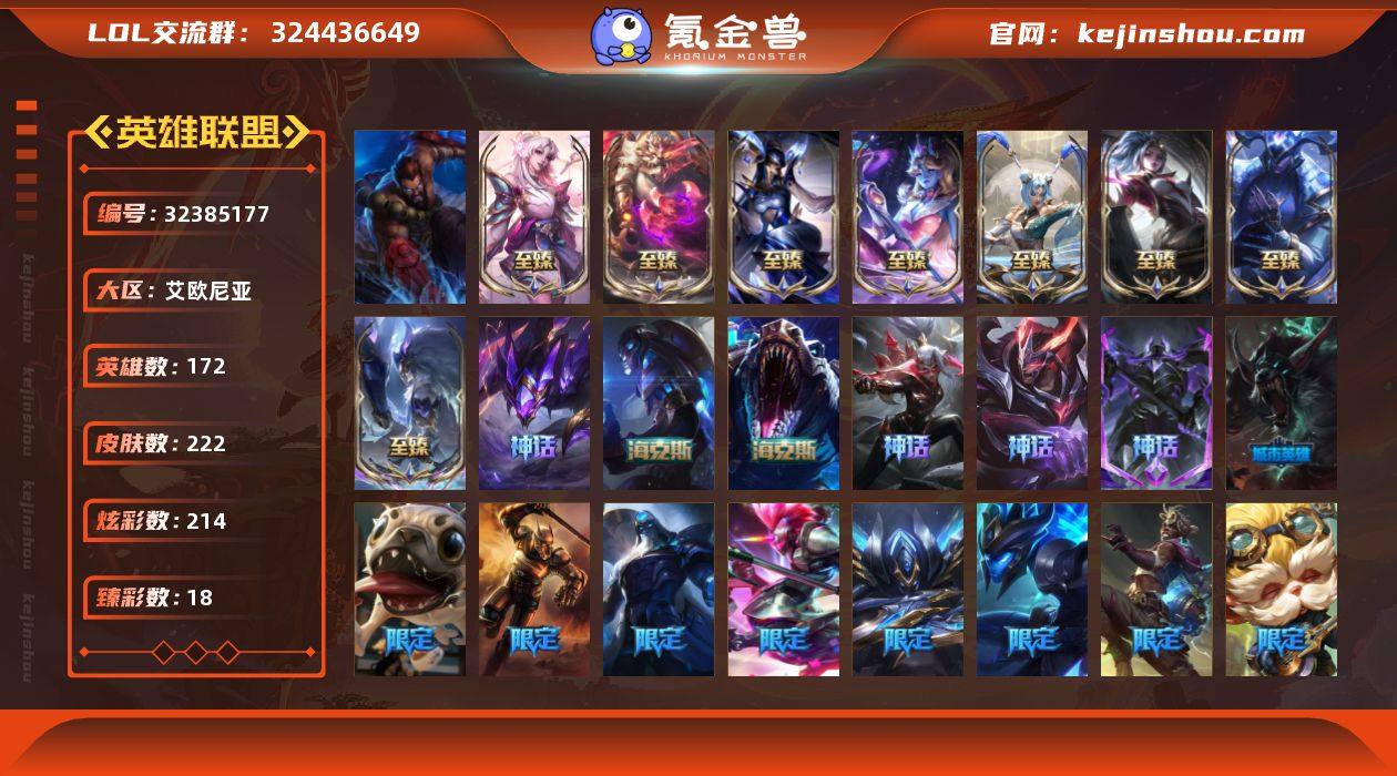 【LDC2831】172英雄/222皮肤/1终极/21神话/35限定/18臻彩/214炫彩/25传说/22史诗/黄金/王佛耶戈/殿堂传奇 薇恩/灰烬骑士 莫德凯撒/堕落神王 盖伦/水晶掠夺者 卡兹克/沉溺暗影卢锡安/海克斯 雷克顿/海克斯 玛尔扎哈/至臻 青花瓷 千珏/至臻 DRX 亚托克斯/至臻 魔女 阿卡丽/至臻 青花瓷 丽桑卓/至臻 神龙尊者均衡之龙 沃利贝尔/至臻 太空律动 魔音海妖 娜美/至臻 玉剑传说 琴仙子/至臻蒙面女郎莫甘娜/至臻 暗裔英雄 嘉文四世/至臻 灵魂莲华 拉克丝/至臻永恒星灵佐伊/至臻 灵魂莲华 劫/至臻 T1 塞拉斯/至臻北极星神梅尔/无畏圣弩 薇恩 绝境狂杀/冠军掠夺者 卡兹克 凯旋圣装/冠军之刃 锐雯 2016 凯旋圣装/神龙尊者 圣龙李青 登龙/玉剑传说 无极 麒麟/黎明使者 锐雯 黑夜使者/泳池派对 奥莉安娜 优雅珠光鲸/霸天巨兽·雪崩 墨菲特/源计划: 火 菲奥娜 惩戒/破败军团 厄运小姐 灵岛征伐使/持七彩冰棍的雪人 易/魔女 阿卡丽 虚荣/净雪之月 莫甘娜 冬虹/踏雪寻梅卡特琳娜/龙马烈焰艾希/龙马烈焰波比/水晶玫瑰 婕拉/水晶玫瑰 斯维因/持胡萝卜的雪人 易/冰雪风暴 希维尔/冰雪节 茂凯/雪默丁格/灵魂守卫/养蜂人 辛吉德/冠军之矛 卡莉丝塔/冠军掠夺者 卡兹克/冠军之志 瑞兹/S1FNC 库奇/S3 SKT...