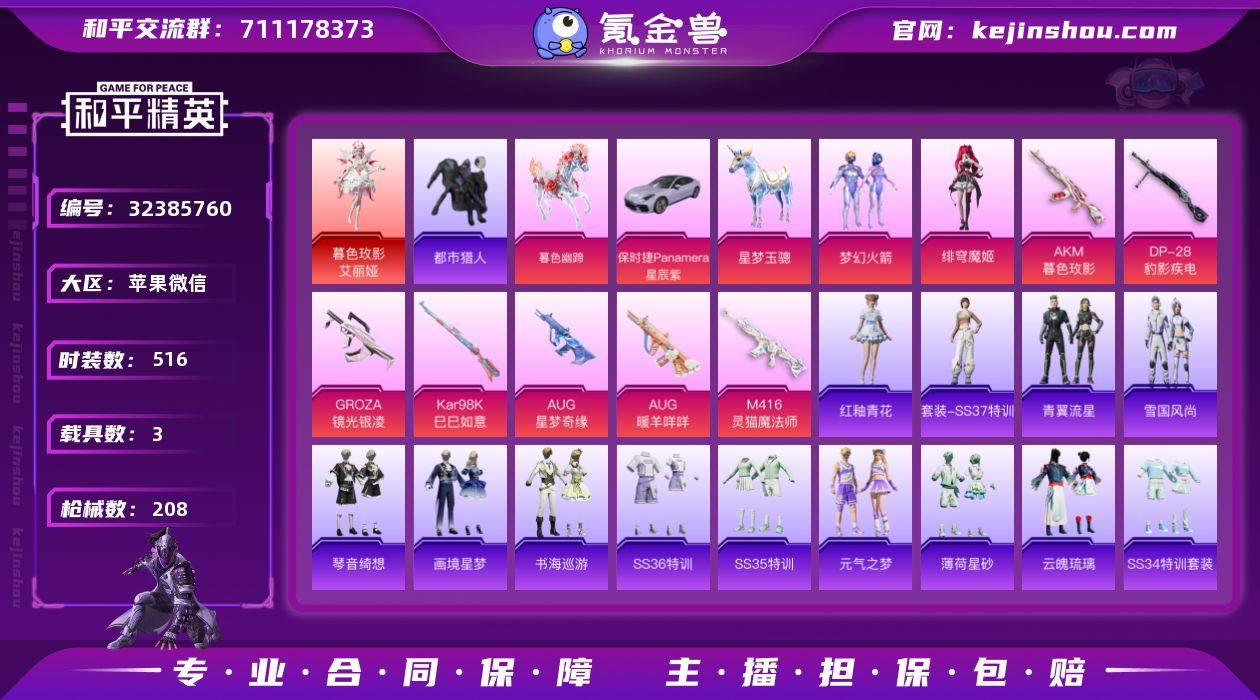 AL691471 【特价苹果v区微信一切正常 身法号梦幻火箭都市猎人1红:暮色玫影-艾丽娅优质武器皮肤:AKM-暮色玫影,GROZA-镜光银凌,M416-灵猫魔法师,AUG-暖羊咩咩,AUG-星梦奇缘,Kar98K-星穹咏叹调,Kar98K-巳巳如意,Mk14-福马献瑞,DP-28-豹影疾电,M338-回旋牧梦使稀有载具:保时捷Panamera(星辰紫),星梦玉骢,暮色幽蹄】 热力值62708 枪皮数量208 粉装数2 套装数量138 时装数516 载具数3 战备数142 其他武器皮肤196 头盔86 动作47 伙伴5 其他武器皮肤:AKM-筑梦精灵,AKM-霓虹街区,AKM-彩虹符号,AKM-虎虎生威,AKM-灼热熔岩,AKM-影袭,AKM-龙的传人,AKM-夜灯,AKM-涂鸦街区,AKM-破晓战魂,GROZA-异彩先驱,GROZA-2B战斗服款,GROZA-福马献瑞,GROZA-治愈之星,GROZA-影袭,GROZA-暮色玫影,M416-红色方程式,M416-蓝色火焰,M416-糯团青竹,M416-紫翼圣骑,ARX-凌霄紫焰,AUG-耀粉歌者,AUG-异域银装,ACE32-画境星梦,ACE32-冰晶雪宝,AC-VAL-甜心亚梦,AC-VAL-天降萌叽,AC-VAL-乌木金纹,QBZ-神秘黑猫,QBZ-赛罗,QBZ-飞驰魅影,QBZ-彩虹符号,Mk47-天之羽翼,Mk47-妙红点点,SCAR-L-红色方程式,SCAR-L-龙宫之主,SCAR-L-碧影闪光,SCAR-L-炫彩节奏,SCAR-L-...