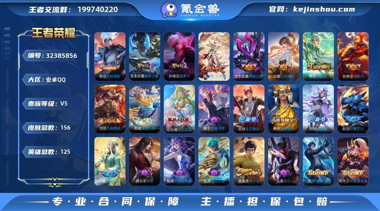 【5113】安卓Q-V5-最强王者段位-125英雄-156皮肤-1典藏皮肤-5传说-46史诗 【荣耀典藏】:韩信弑枪猎影 【传说皮肤】:澜愿照九州拓,云缨幻光神枪,桑启鸣野蒿,宫本武藏地狱之眼,孙悟空地狱火 【限定皮肤】:蒙犽顽岩魄,姜子牙天穹之誓,狄仁杰阴阳师,赵云皇家上将,赵云引擎之心,孙尚香蔷薇恋人,高渐离玩趣恶龙,元歌无心,典韦蓝屏警告,项羽海滩派对,百里玄策原初追逐者,裴擒虎李小龙,鲁班大师探海日志,阿古朵江河有灵,张良古海寻踪,蒙犽百解令,蒙恬荣光圣徽,鬼谷子天穹祈灯,鲁班七号蔬乡物语,李元芳蔬乡物语,刘邦剑破天穹,程咬金群星魔术团,周瑜熔金海岸 【年限皮肤】:澜愿照九州拓 【赛季限定】:鲁班大师探海日志,张良古海寻踪,鬼谷子天穹祈灯,刘邦剑破天穹,姜子牙天穹之誓,东皇太一噬灭天穹,太乙真人谧流熔炉,钟馗虚灵犬护,甄姬逆浪荇歌,亚瑟荣光之誓,百里玄策原初追逐者,蒙恬荣光圣徽,牛魔星界战将,项羽九幽镇关 【战令限定】:典韦蓝屏警告,鲁班七号蔬乡物语,李元芳蔬乡物语,亚连破空之剑,孙悟空神迹守卫,周瑜线条小狗 【史诗皮肤】:周瑜线条小狗,项羽九幽镇关,公孙离涂山容容,黄忠百相守梦,狂铁龙之律动,阿轲化蝶舞,...