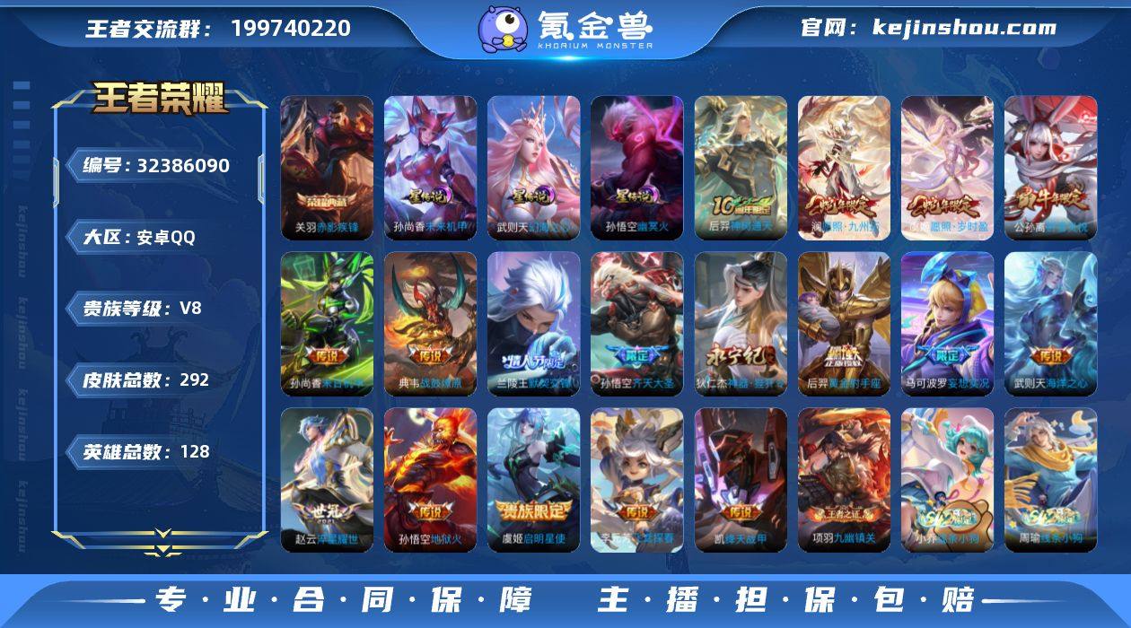 【特价出售/店主推荐】3金标、发育路30段,安卓Q-V8-最强王者段位-128英雄-292皮肤-1典藏皮肤-1典藏英雄-3星传说-17传说-88史诗 【英雄全皮】:孙权全皮 【荣耀典藏】:武则天英雄,关羽赤影疾锋 【传说皮肤】:后羿神树通天,澜愿照九州拓,虞姬愿照岁时盈,典韦战鼓燎原,马可波罗妄想实况,孙悟空齐天大圣,狄仁杰神器狴犴令,赵云淬星耀世,李元芳飞鸢探春,兰陵王默契交锋,公孙离祈雪灵祝,铠绛天战甲,虞姬启明星使,后羿黄金射手座,孙尚香末日机甲,孙悟空地狱火,武则天海洋之心 【限定皮肤】:白起狰,姜子牙天穹之誓,狄仁杰阴阳师,赵云皇家上将,赵云引擎之心,赵云龙胆,赵云百木心枪,墨子神迹守卫,妲己时之彼端,孙尚香蔷薇恋人,鲁班七号狮舞东方,鲁班七号乒乒小将,庄周高山流水,高渐离玩趣恶龙,钟无艳超时空战士,周瑜赤莲之焰,元歌云间偶戏,元歌无心,夏侯惇朔风刀,甄姬游园惊梦,甄姬落雪兰心,曹操烛龙,典韦穷奇,典韦蓝屏警告,典韦岱宗,马可波罗暗影游猎,马可波罗山海玄木吟,马可波罗妄想实况,狄仁杰魔术师,狄仁杰万华元夜,狄仁杰神器狴犴令,达摩星际陆战队,达摩沙漠行僧,项羽海滩派对,老夫子醍醐杖,老夫子航海奇遇记,关羽百相...