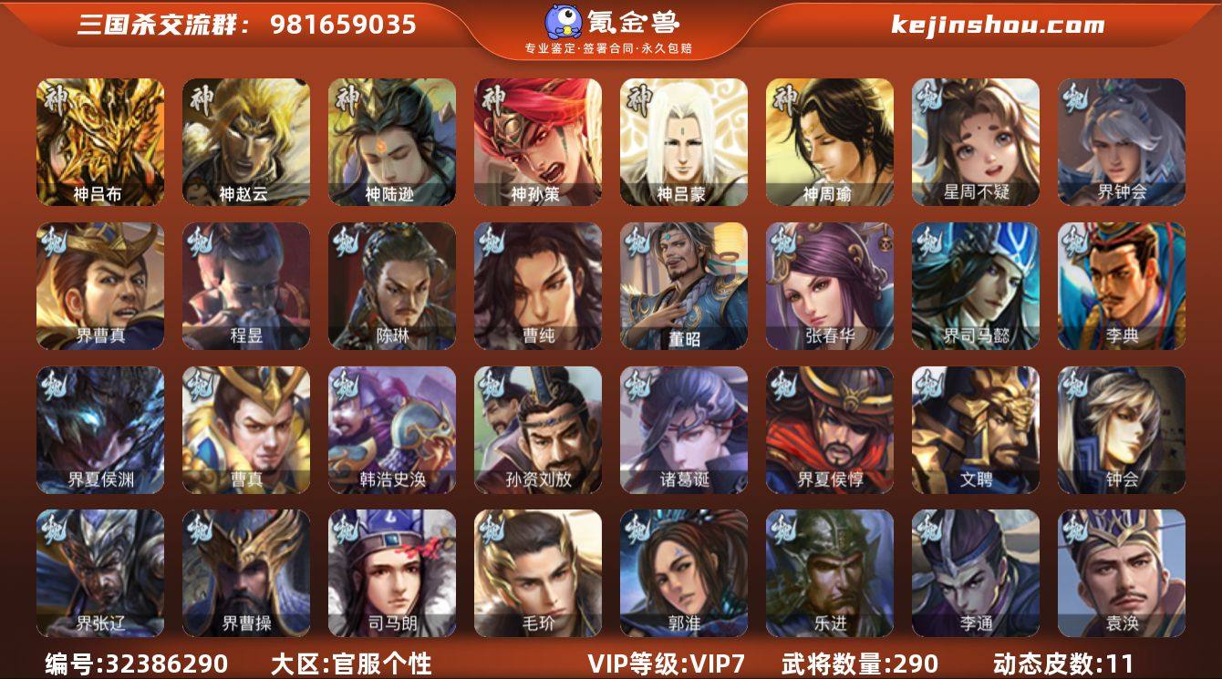 【14789598】官阶:骠骑将军;VIP等级:VIP7;史诗武将数量:24;动态皮肤数量:11;武将总数:290;史诗宝珠数量:2;将魂数量:10199;神将:4;魏国史诗武将:2;蜀国史诗武将:6;吴国史诗武将:3;群史诗武将:5