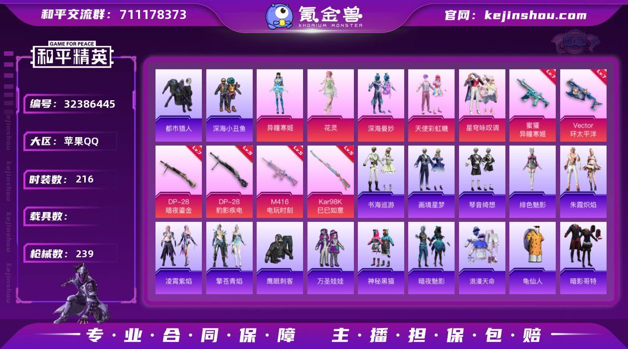 苹果 手Q-7粉装-4特效枪-3载具-3粉色飞行器-70219热力值-11王牌印记-174套装-214枪皮 【热门品类】:粉装-梦幻火箭,套装-金羽特工,套装-龟仙人 【粉色套装】:粉装-梦幻火箭,角色-复仇流浪者,粉装-朗月武圣,粉装-旋转彩虹,粉装-第五大道,超级赛亚人-孙悟空,粉装-星穹咏叹调 【粉色枪皮等级】:M416-全功率超战(五级),GROZA-旋转彩虹(七级),Kar98K-巳巳如意(五级),DP-28-豹影疾电(五级) 【粉色载具】:路特斯EVIJA(星际黄),玛莎拉蒂Quattroporte(夜幕蓝),焰龙咆哮,僚机-萌兔起飞 【粉色枪皮】:M416-全功率超战,GROZA-旋转彩虹,Kar98K-巳巳如意,DP-28-豹影疾电 【粉色飞行器】:冷魅冰骑飞行器,星梦奇缘飞行器 【粉色降落伞】:绝对恒星降落伞,梦幻火箭降落伞,风花雪月降落伞,蓝莓炮弹降落伞,绿意幻情降落伞,千面幻镜降落伞,旋转彩虹降落伞,海螺星光降落伞,第五大道降落伞,龙珠超降落伞,莲影清波降落伞,星梦奇缘降落伞,千金淑猫降落伞,星穹咏叹调降落伞,幻彩电音降落伞,喜羊羊与灰太狼降落伞,炫彩糖果降落伞 【稀有套装】:套装-龟仙人,角色-超感刻度,套装-雪国风尚,套装-炫彩糖果,角色-摩登魅猫,套装-朱霞炽焰,套装-凌霄紫焰,套装-擎苍青焰,角色-绯色魅影,套装-画境星梦,套装-琴音绮想 【稀有枪皮】:AUG-冰晶雪宝,AKM-彩虹符号,AKM-影袭,AKM-灼热熔岩,AKM-破晓战魂,AKM-霓虹街区,AKM-龙的传人,M16A4-幻世战舞者,M16A4-甜心亚梦,M16A4-红色方程式,SCAR-L-夜灯,SCAR-L-炫彩节奏,SCAR-L-玉兔迎春,SCAR-L-红色方程式,M416-糯团青竹,M416-红色方程式,M416-蓝色火焰,M416-诡夜天鹅,GROZA-异彩先驱,GROZA-影袭,GROZA-懵萌河马,GROZA-春暖花开,GROZA-田园牧歌,GROZA-蓝莓炮弹,AUG-耀粉歌者,AUG-绝对恒星,QBZ-彩虹符号,QBZ-飞驰魅影,M762-天...