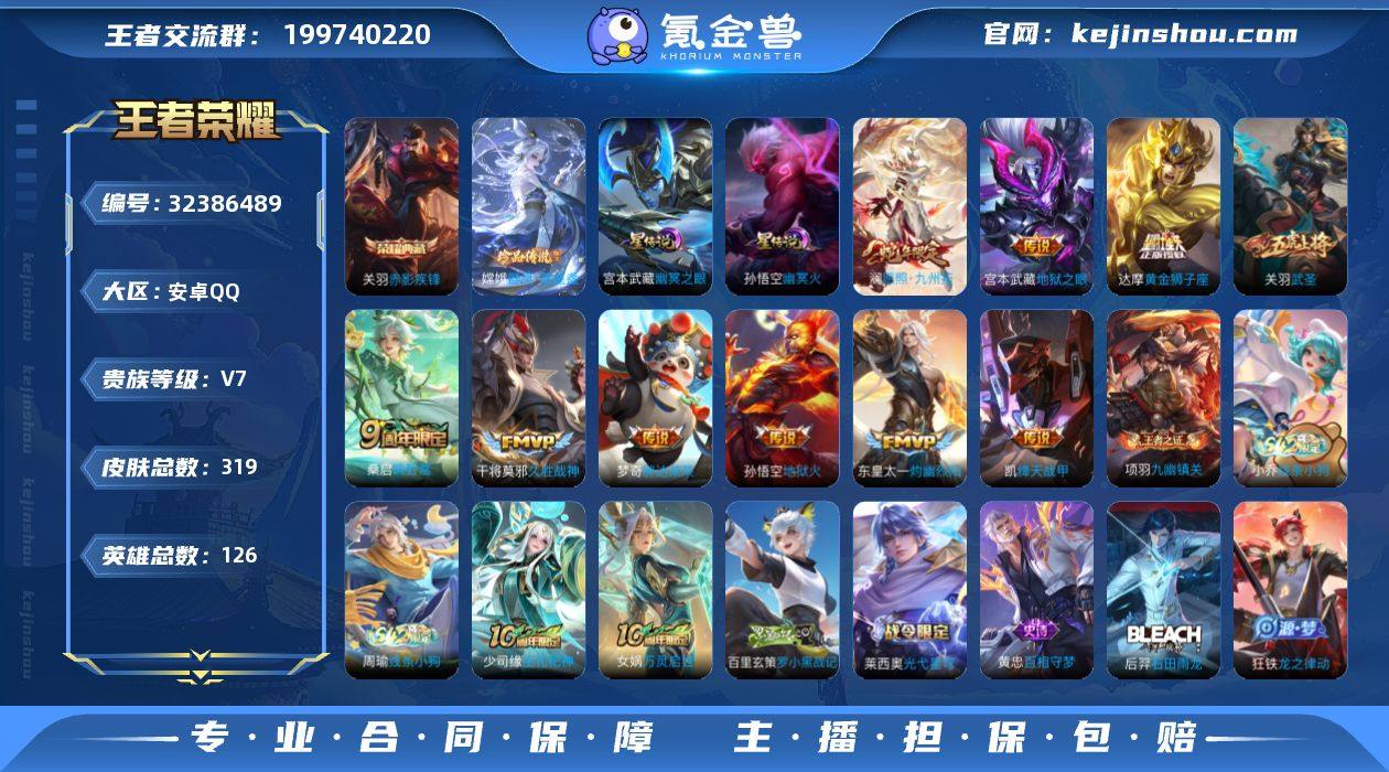 可二次【特价出售/店主推荐/1省标/2市标/】:安卓Q-V7-至尊星耀V段位-126英雄-319皮肤-1典藏皮肤-1珍品传说-2星元-10传说-89史诗 【英雄全皮】:刘禅全皮,孙权全皮,敖隐全皮,戈娅全皮,空空儿全皮,影全皮 【荣耀典藏】:关羽赤影疾锋 【珍品传说】:嫦娥器灵落星盏 【传说皮肤】:澜愿照九州拓,桑启鸣野蒿,东皇太一灼幽烈阳,铠绛天战甲,关羽武圣,干将莫邪久胜战神,达摩黄金狮子座,梦奇胖达荣荣,宫本武藏地狱之眼,孙悟空地狱火 【限定皮肤】:虞姬夏日便利店,姜子牙天穹之誓,狄仁杰阴阳师,赵云皇家上将,赵云引擎之心,孙尚香蔷薇恋人,庄周高山流水,高渐离玩趣恶龙,钟无艳超时空战士,扁鹊奇幻香踪,白起夜都怪侠,芈月幻夜卜梦,吕布猎兽之王,元歌无心,甄姬落雪兰心,典韦蓝屏警告,马可波罗暗影游猎,狄仁杰魔术师,达摩沙漠行僧,项羽海滩派对,关羽武圣,程咬金演武夺筹,兰陵王金庭之子,后羿圣弓游侠,李元芳云中旅人,杨戬潮玩骑兵,干将莫邪真爱魔法,鬼谷子五谷丰年,黄忠火炮绅士,苏烈千军破阵,百里玄策原初追逐者,梦奇顽趣,沈梦溪大漠名商,明世隐吟游魔法,裴擒虎李小龙,裴擒虎擒涛扼浪,云中君纤云弄巧,猪八戒猪悟能,嫦娥拒霜思,嫦...