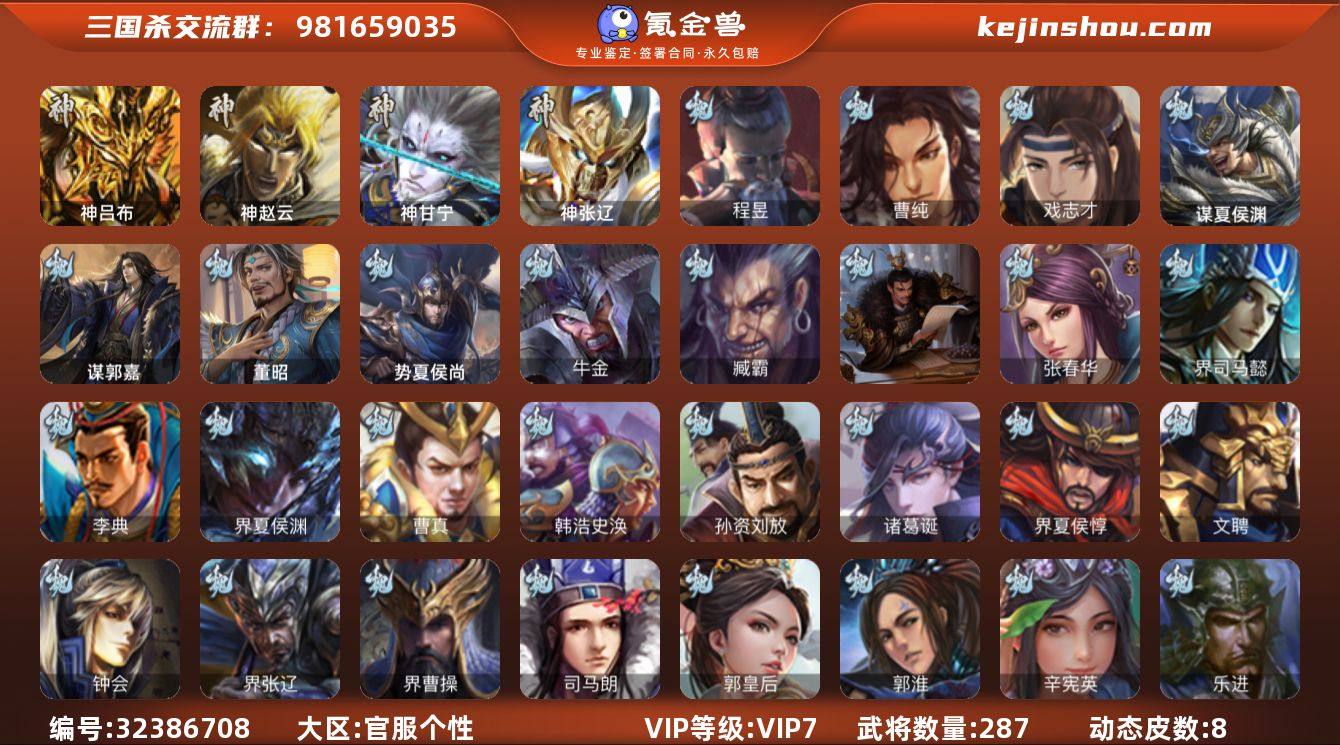 【2812】官阶:骠骑将军;VIP等级:VIP7;史诗武将数量:22;动态皮肤数量:8;武将总数:287;史诗宝珠数量:4;将魂数量:119;神将:4;魏国史诗武将:5;蜀国史诗武将:4;吴国史诗武将:4;群史诗武将:8