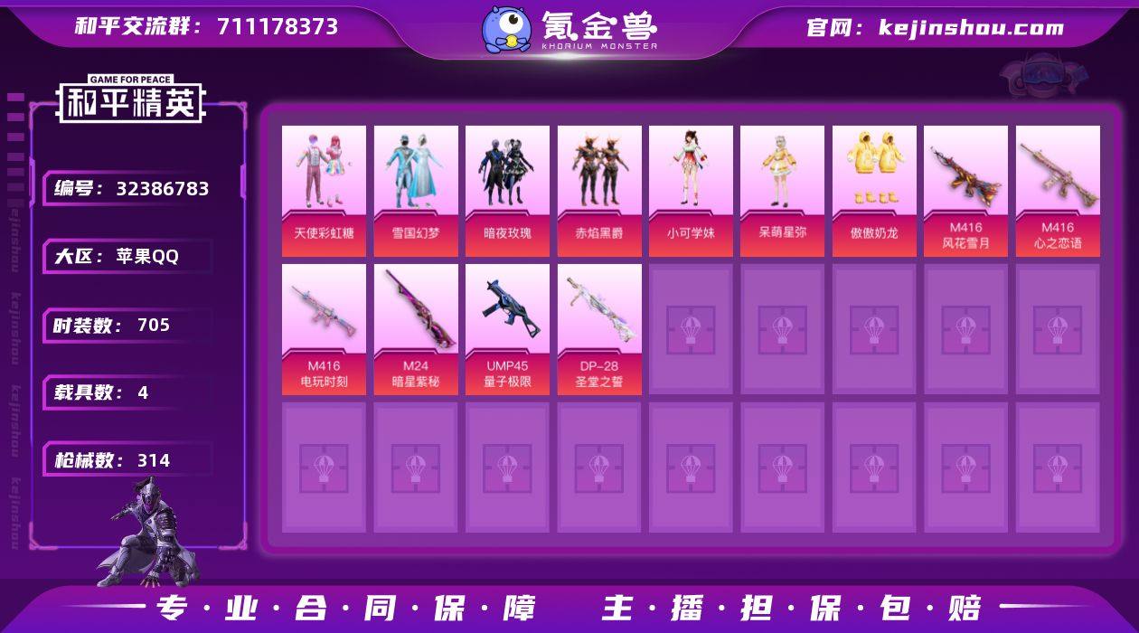 【稀有枪皮】GROZA-精灵之光,Kar98K-圣域龙灵,AMR-智耀战神,MK14-樱桃泡泡,MG3-辉羽雀灵,M416电玩时刻,UMP45量子极限,Kar98K-巳巳如意,PKM-萌骑夺宝,DP-28-豹影疾电,M416风花雪月,M416心之恋语,M24暗星紫秘,P90沙丘之主