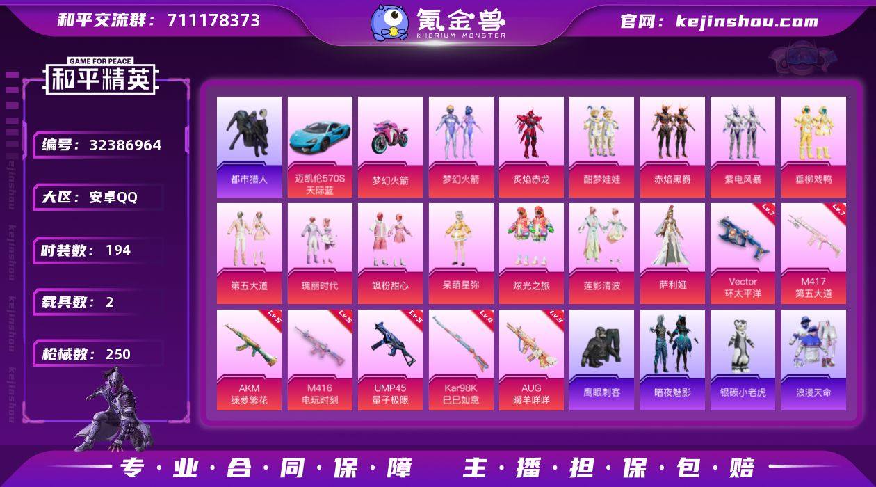 实名:可二次实名 是否支持人脸包赔:支持 粉装数量:6 特效枪数量:16 载具数:1 时装数:922 枪械数:319 奇异狩猎者,都市猎人,深海小丑鱼 绯穹魔姬,洛天依,莲影清波,千金淑猫,吟月归客,仲夏莫吉托 七级AKM-梦之光华,七级M416-五爪金龙,七级SCAR-L-纯梦嫁纱,五级MK14-福马献瑞,五级AKS-74U-森灵之息,五级DP-28-豹影疾电,五级MG-36-沧焰双生,五级AKM-绿萝繁花,五级AUG-暖羊咩咩,五级GROZA-镜光银凌,五级Kar98K-巳巳如意,五级M762-青锋波束,五级SCAR-L-锦绣绵绵,五级UMP45-量子极限,四级M416-电玩时刻,三级ACE32-萌骑漫游 冰绡玉鳞 狙击之神,阿虎,罗莉,马上有钱,福马献瑞,红釉青花,绿洲幽影,SS37特训,雨过天青,青翼流星,阳光菠萝,雪国风尚,SS36特训,荧光像素,奇异狩猎者,粉黛兰香,萌鸡速递,紫俏灵猫,风迹短诗,SS35特训,午间小调,薄荷星砂,云魄琉璃,蛇蝎美人,狂鲨锋刃,凌霄紫焰,擎苍青焰,SS34特训套装,游乐,朱霞炽焰,Alan Walker电音教主,Alan Walker,暗影哥特,暗夜魅影,冰川格斗者,冰冻风暴,缤纷果语,冰公主,冰河战士,白糯汤圆,白色伏地魔,白熊同盟,春光漫游,雏菊兔兔,长空猛禽,潮流炫酷,创世·追猎,晨曦薄雾,纯真浪花,蝶变,呆萌铁蟹,都市丽猫,都市猎人,都市魅力,蝶吟花词,飞驰魅影,绯格组合,福星高照,飞行日记,格斗先锋,龟仙人,光之冒险,幻彩翩翩,海岛探路者,鹤鸣,湖蓝色名流,湖畔霞光,黑色伏地魔,黄色伏地魔,黄色名流,黄色运动,红色运动,幻世战舞者,黑夜传说,幻影公爵,幻羽潜行,幻影武者,火种守卫者,极地朋克,晶辉守护,酒红色名流,惊鸿侠骨,橘黑制服,娇憨猪猪,竞技达人朋克,竞技名士,吉莉礼服,激萌罗小黑,极速红龙,极速竞梦,街头潮人,街头风暴,军械专家,锦衣飞扬,金耀舞者,酷潮明星,空岛之星,快闪甜心,空投萌叽,蓝冰羽,蓝彩潮人,蓝调潮人,龙的传人,拉斐尔,龙魂突击队,猎鹰,六六大吉,萝兰蝴蝶,黎明保卫者,猎梦纪元,浪漫天命,蓝色运动,龙腾端午,罗小黑,恋语绒绒,冷焰舞者,Mark.06,漫步者,摩登艾咪,猛禽,妙红点点,棉花软糖,萌黄之夏,魅力单车,麻辣教官,蜜露汐语,懵萌河马,曼妙人鱼,萌趣咩咩,萌神柯基,明鸳圣池,霓虹极客,霓虹街区,怒火燎原,霓虹热舞,柠萌假日,牛气冲天,牛气满满,破蛋小黄鸡,破晓战魂,轻风白浪,绮丽涂鸦,青年教官,青团波波,俏兔智灵,清新柠檬,青玉碎影,云朵鹅,瑞龙福将,荣耀,热情海星,人气偶像,热血青春,热血骑手,忍者信条,深海小丑鱼,深蓝色名流,森林游猎者,沙漠兵团,沙漠毒蛇,神气柴柴,沙丘之歌,SS17特训,SS18特训,SS19特训,SS20特训,SS21特训,SS22特训,SS23特训,SS24特训,SS25特训,SS26特训,SS27特训,SS28特训,SS29特训,SS30特训套装,SS31特训套装,SS32特训套装,SS33特训套装,巳巳如意,酸甜橘柚,水银刺客,探宝勇士,涂山之恋,糖糖葫芦,特训学院,甜心亚梦,团圆交子,田园牧歌,特战装甲,WiFi精灵,完美偶像,王牌教练,小丑鱼,迅捷狂鲨,炫蓝之夏,雪绒豹,旭日情侣,夏日倾情,夏日音浪,血色贵族,雪山精英,雪兔飞飞,香桃花海,星途旅人,小熊娃娃,虚音幻奏,雪鹰学院,夏雨游龙,迎春赐吉,异彩先驱,耀粉歌者,摇滚战魂,荧惑魅影,隐空刺,原力风暴,雨林探路者,音速流光,影双刃,玉兔迎春,源星混沌,云霞荷露,野性战心,鹰眼