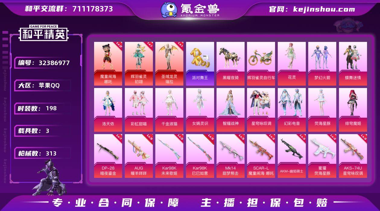 J2058 【精品红装号】4红 13粉 15特 3载 4级艾丽娅 2级哪吒 1级孔雀 1级瑞拉 金鞋 花灵 梦幻火箭 蝶舞迷情 绯穹魔姬 洛天依 千金淑猫 幻彩电音 霁蓝缠春 满级枪*3 苹果 手Q-4神装-13粉装-15特效枪-3载具-13粉色飞行器-116984热力值-12王牌印记-198套装-313枪皮 【红色神装等级】:暮色玫影-艾丽娅(四级),魔童闹海-哪吒(二级),辉羽雀灵-初翊(一级),圣域龙灵-瑞拉(一级) 【红色角色神装】:暮色玫影-艾丽娅,魔童闹海-哪吒,辉羽雀灵-初翊,圣域龙灵-瑞拉 【热门品类】:粉装-梦幻火箭,套装-浪漫天命,套装-派对舞王,套装-龟仙人,套装-暗影哥特,套装-粉红小猪,角色-Mark.06 【粉色套装】:粉装-蝶舞迷情,粉装-梦幻火箭,角色-洛天依,粉装-彩虹甜喵,角色-千金淑猫,角色-女娲灵识,角色-智耀战神,粉装-星穹咏叹调,粉装-幻彩电音,角色-荧海星豚,角色-绯穹魔姬,角色-花灵,角色-霁蓝缠春 【粉色枪皮等级】:AKM-幽焰骑士(三级),AKM-暮色玫影(二级),SCAR-L-魔童闹海 哪吒(三级),AUG-暖羊咩咩(五级),蜜獾-荧海星豚(三级),蜜獾-异瞳寒姬(一级),AKS-74U-星穹咏叹调(三级),AKS-74U-森灵之息(四级),Kar98K-未来歌姬(五级),Kar98K-巳巳如意(五级),Kar98K-圣域龙...