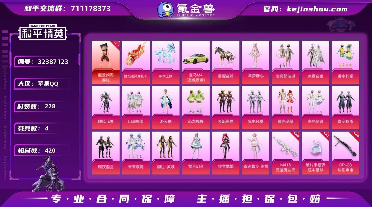 J2339 精品 1红 20粉 18特 4载具 1僚机 3级哪吒 洛天依 恐龙拽拽 寒光使者 紫电风暴 创世 未来歌姬 绯穹魔姬 9级灵猫魔法师 苹果 手Q-1神装-20粉装-18特效枪-4载具-12粉色飞行器-155264热力值-23王牌印记-278套装-420枪皮 【红色神装等级】:魔童闹海-哪吒(三级) 【红色角色神装】:魔童闹海-哪吒 【热门品类】:角色-军刀雅典娜,套装-忍者信条,套装-龟仙人,角色-Mark.06 【粉色套装】:粉装-宝贝奶油派,粉装-冰霜白皇,粉装-香水柠檬,粉装-飓风飞鹰,粉装-山涧鹿灵,角色-洛天依,粉装-恐龙拽拽,粉装-赤焰黑爵,粉装-紫电风暴,粉装-霞光圣骑,粉装-寒光使者,粉装-青空秋雨,粉装-暗夜鎏金,粉装-未来歌姬,套装-创世·救赎,粉装-雪月幻音,角色-绯穹魔姬,角色-奇迹舞步 美雪,角色-羊梦糖心,角色-霁蓝缠春 【粉色枪皮等级】:SCAR-L-魔童闹海 哪吒(三级),M416-暖熊萌萌(二级),M416-灵猫魔法师(九级),GROZA-镜光银凌(五级),AUG-星之彼岸(五级),AUG-暖羊咩咩(五级),蜜獾-荧海星豚(四级),ACE32-萌骑漫游(三级),AKS-74U-森灵之息(五级),P90-魔童闹海 敖丙(三级),Kar98K-巳巳如意(五级),Mk14-甜梦熊击(五级),Mk14-福马献瑞(一级),M249-绝对恒星(四级),DP-...