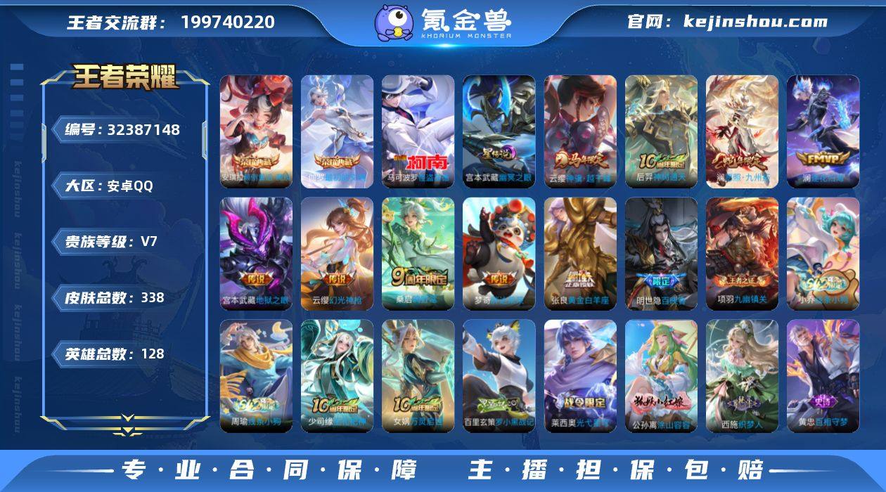 【特价急出/详情看图】安卓Q-V7-最强王者段位-128英雄-338皮肤-2典藏皮肤-1星元-1珍品传说-9传说-77史诗 【英雄全皮】:刘禅全皮,孙权全皮,敖隐全皮,蒙恬全皮,空空儿全皮,影全皮 【荣耀典藏】:伽罗最初的交响,安琪拉颠倒童话魔镜 【珍品传说】:马可波罗怪盗基德 【传说皮肤】:云缨神骥越千峰,后羿神树通天,澜愿照九州拓,云缨幻光神枪,桑启鸣野蒿,澜逐花归海,张良黄金白羊座,梦奇胖达荣荣,宫本武藏地狱之眼 【限定皮肤】:蒙犽顽岩魄,大乔绒语心约,姜子牙天穹之誓,杨戬破阵退雄兵,狄仁杰阴阳师,赵云皇家上将,嬴政优雅恋人,庄周高山流水,高渐离玩趣恶龙,元歌云间偶戏,元歌无心,马可波罗暗影游猎,马可波罗山海玄木吟,狄仁杰魔术师,达摩沙漠行僧,项羽海滩派对,李元芳云中旅人,雅典娜单词大作战,雅典娜黎明之约,鬼谷子五谷丰年,百里玄策原初追逐者,梦奇顽趣,沈梦溪大漠名商,裴擒虎擒涛扼浪,米莱狄胡桃异想国,西施玲珑珍味,鲁班大师探海日志,桑启海盐诗旅,艾琳流音漫舞,阿古朵江河有灵,张良古海寻踪,蒙恬荣光圣徽,妲己灵卜魔法,鬼谷子天穹祈灯,沈梦溪龙舞盛年,李元芳蔬乡物语,刘邦剑破天穹,程咬金群星魔术团,项羽苍威无极,...