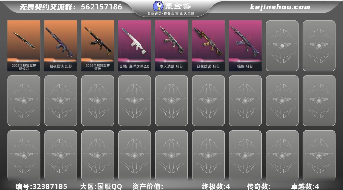 25冠军套天玄刀鱼缸幻影 【套装】:2025全球冠军赛套装 【英雄】:炼狱,暮蝶,壹决,捷风,雷兹,幽影,不死鸟,贤者,猎枭,芮娜,尚勃勒,夜露,K/O 【近战武器】:近战武器-2025全球冠军赛 蝴蝶刀,近战武器-天玄刀 【狂徒】:狂徒-2025全球冠军赛,狂徒-堕天遗武,狂徒-掠影,狂徒-日冕雄师 【幻影】:幻影-黯夜怪谈,幻影-海洋之星//2.0 【骇灵】:骇灵-无限竞技 【卡面】:Clutch 卡面,瓦娃脸雪糕 卡面 ,无畏契约GO!第一卷:芮娜 卡面,无畏契约GO!第一卷:零 卡面,暗枪 卡面,钢锁vs盖可 卡面,代号红色 卡面,新兵报到 卡面,V契约 卡面,无畏契约 卡面 【喷漆】:买装还是存钱 喷漆,胜利属于无畏契约 喷漆,GLHF 喷漆,无畏契约 喷漆 【挂饰】:天外飞客 挂饰,无畏契约 纪念币 挂饰