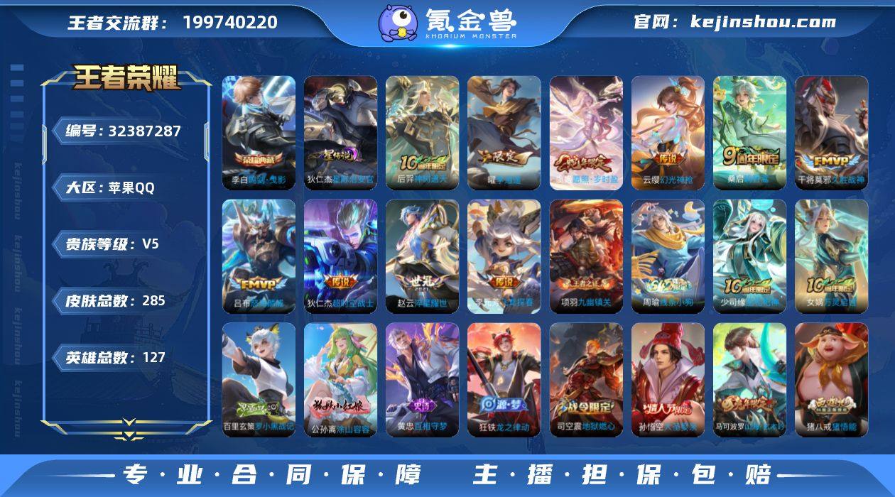 苹果Q-V6-至尊星耀V段位-122英雄-145皮肤-1无双-6传说-33史诗 【无双皮肤】:李信问心剑 【传说皮肤】:关羽神骥镇沧海,马超神骥逐星野,孙悟空齐天大圣,马超无双飞将,伽罗太华,貂蝉猫影幻舞 【限定皮肤】:白起狰,狄仁杰阴阳师,虞姬凯尔特女王,赵云皇家上将,嬴政白昼王子,孙尚香蔷薇恋人,芈月重明,吕布猎兽之王,周瑜赤莲之焰,夏侯惇朔风刀,曹操烛龙,典韦穷奇,狄仁杰魔术师,狄仁杰万华元夜,项羽海滩派对,老夫子醍醐杖,程咬金演武夺筹,兰陵王驯魔猎人,兰陵王金庭之子,孙悟空美猴王,孙悟空大圣娶亲,孙悟空齐天大圣,牛魔御旌,李元芳银河之约,李元芳云中旅人,钟馗驱傩正仪,杨玉环遇见飞天,蔡文姬繁星吟游,太乙真人饕餮,鬼谷子原初探秘者,鬼谷子五谷丰年,弈星混沌棋,沈梦溪星空之诺,沈梦溪大漠名商,明世隐疑决卦,裴擒虎天狼狩猎者,裴擒虎李小龙,狂铁御狮,米莱狄御霄,伽罗太华,盾山御銮,上官婉儿梁祝 【年限皮肤】:孙悟空美猴王,伽罗太华 【赛季限定】:虞姬凯尔特女王,白起狰,太乙真人饕餮,曹操烛龙,芈月重明,典韦穷奇,狂铁御狮,米莱狄御霄,牛魔御旌,盾山御銮,夏侯惇朔风刀,弈星混沌棋,明世隐疑决卦,老夫子醍醐杖,鬼...