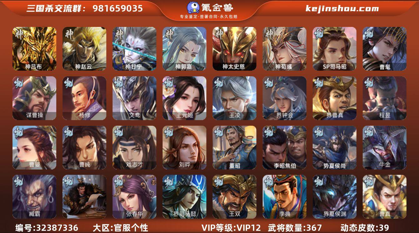 【2862】官阶:大将军;VIP等级:VIP12;史诗武将数量:52;动态皮肤数量:39;武将总数:367;史诗宝珠数量:20;将魂数量:18046;神将:6;魏国史诗武将:20;蜀国史诗武将:7;吴国史诗武将:9;群史诗武将:18 神吕布,神赵云,神甘宁,神郭嘉,神太史慈,神荀彧,SP司马昭,曹髦,谋曹操,杨修,王元姬,王凌,界钟会,界曹真,曹婴,曹纯,戏志才,刘晔,程昱,谋诸葛亮,谋黄忠,谋马超,沙摩柯,花鬘,董允,鲍三娘,谋陆逊,周处,孙寒华,骆统,留赞,界徐盛,贺齐,文鸯,十常侍,左慈,张琪瑛,星黄忠,星甘宁,苏飞,麹义,庞德公,南华老仙,刘焉,沮授,界左慈,界李儒,公孙康,谋张角,许攸,星董卓,兀突骨,势夏侯尚,SP关羽,SP曹仁,SP蔡文姬,乐进,曹昂,诸葛诞,朱灵,文聘,SP姜维,张春华,钟会,曹冲,郭淮,满宠,界王异,界曹操,界司马懿,界夏侯惇,界张辽,界许褚,界郭嘉,李典,曹真,韩浩史涣,陈群,曹叡,曹休,钟繇,司马朗,李通,郭皇后,孙资刘放,辛宪英,吕虔,鲁芝,蒯越蒯良,界荀彧,杜畿,张恭,界曹植,界满宠,界郭淮,卞夫人,华歆,袁涣,王双,崔琰,毛玠,杨阜,阮慧,谋徐晃,谋于禁,界曹休,牵招,胡班,李昭焦伯,牛金,界夏侯渊,臧霸,唐咨,董昭,SP孙尚香,关银屏,夏侯霸,马良,关兴张苞,廖化,界马岱,关平,简雍,刘封,界法正,界关兴张苞,界刘备,界...