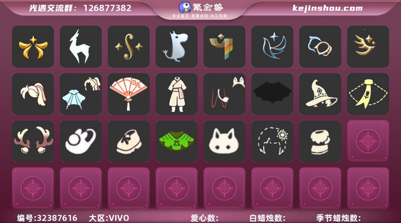 翼数量:235 欧若拉季,九色鹿季,二重奏季,姆明季,彩染季,青鸟季,双星季,迁徙季 宝骏丹心马尾礼包,青衫落拓礼包,献瑞折扇礼包,彩虹武士裤,姆明饰品套装,蝙蝠套,巫师,围巾,鹿角,兔子鞋,运动鞋,粽叶,兔子,雪花,雪人鞋 卖家说:巫师暗彩蝙蝠斗小漂亮,物品以截图为准,蜡烛会上下浮动