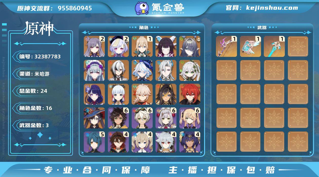 总黄数: 24 冒险等级: 56 2命金色角色: 二命七七,二命刻晴 1命金色角色: 一命琴 0命金色角色: 迪卢克,枫原万叶,神里绫华,莫娜,雷电将军,纳西妲,迪希雅,那维莱特,芙宁娜,阿蕾奇诺,梦见月瑞希,菈乌玛,哥伦比娅 拥有武器: 飞雷之弦振,天空之卷,天空之刃 1精武器: 飞雷之弦振,天空之卷,天空之刃