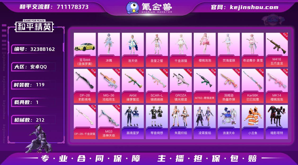 J2615 精品 8粉 18特 1载具 小舞 洛天依 樱桃泡泡 千金淑猫 小丑鱼 荧海星豚 圣堂之誓 满级五爪金龙 安卓 手Q-8粉装-18特效枪-1载具-1粉色飞行器-68513热力值-7王牌印记-119套装-212枪皮 【热门品类】:套装-浪漫天命,套装-小丑鱼,套装-暗影哥特 【粉色套装】:角色-洛天依,角色-圣堂之誓,角色-千金淑猫,角色-樱桃泡泡,角色-荧海星豚,角色-奇迹舞步 美雪,角色-冰魄,人物-小舞·雪昙 【粉色枪皮等级】:AKM-绿萝繁花(五级),SCAR-L-锦绣绵绵(五级),M416-五爪金龙(七级),GROZA-镜光银凌(五级),M762-青锋波束(五级),ACE32-萌骑漫游(五级),UMP45-萌骑冒险(五级),汤姆逊-热量炸弹(五级),AKS-74U-森灵之息(五级),Kar98K-巳巳如意(五级),Mk14-樱桃泡泡(五级),Mk14-福马献瑞(二级),AA12-G-萌骑幻想(五级),DP-28-千金淑猫(五级),DP-28-豹影疾电(五级),MG3-洛神天依(五级),PKM-萌骑夺宝(五级),MG-36-沧焰双生(五级) 【粉色载具】:宝马M4(圣保罗黄) 【粉色枪皮】:AKM-绿萝繁花,SCAR-L-锦绣绵绵,M416-五爪金龙,GROZA-镜光银凌,M762-青锋波束,ACE32-萌骑漫游,UMP45-萌骑冒险,汤姆逊-热量炸弹,AKS-74U-森灵之息,Kar98K-巳巳如意,Mk14-樱桃泡泡,Mk14...