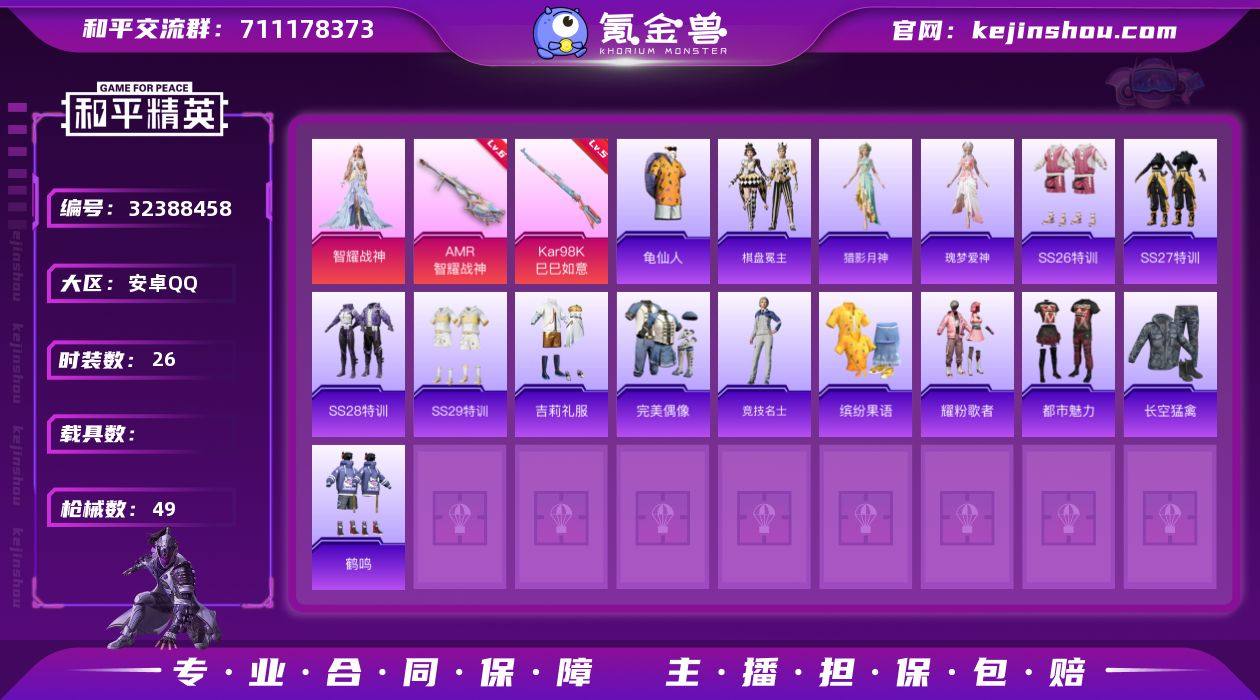 J2689 精品 1粉 2特 智耀战神 安卓 手Q-1粉装-2特效枪-0载具-1粉色飞行器-13057热力值-3王牌印记-26套装-49枪皮 【热门品类】:套装-龟仙人 【粉色套装】:角色-智耀战神 【粉色枪皮等级】:Kar98K-巳巳如意(五级),AMR-智耀战神(六级) 【粉色枪皮】:Kar98K-巳巳如意,AMR-智耀战神 【粉色飞行器】:墨金战记飞行器 【粉色降落伞】:智耀战神降落伞 【稀有套装】:套装-龟仙人,套装-棋盘冕主,角色-猎影月神,角色-瑰梦爱神 【稀有枪皮】:AKM-破晓战魂,SCAR-L-炫彩节奏,M416-红色方程式,AUG-天降萌叽,AUG-耀粉歌者,QBZ-彩虹符号,M762-天降萌叽,M762-彩虹符号,AC-VAL-天降萌叽,UZI-啾咪啾咪,UMP45-蓝色火焰,汤姆逊-智耀战神,Kar98K-彩虹符号,Kar98K-红色方程式,SKS-炫彩节奏,Mini14-耀粉歌者,S12K-智耀战神,M249-彩虹符号,M249-破晓战魂,DP-28-彩虹符号,MG3-幻世战舞者,MG3-智耀战神,TMP-9-萌萌史莱姆 【其他套装】:套装-SS26特训,套装-SS27特训,套装-SS28特训,套装-SS29特训,套装-吉莉礼服,套装-完美偶像,套装-竞技名士,套装-缤纷果语,套装-耀粉歌者,套装-都市魅力,套装-长空猛禽,套装-鹤鸣,套装-龟仙人 【营地ID】:1049238133