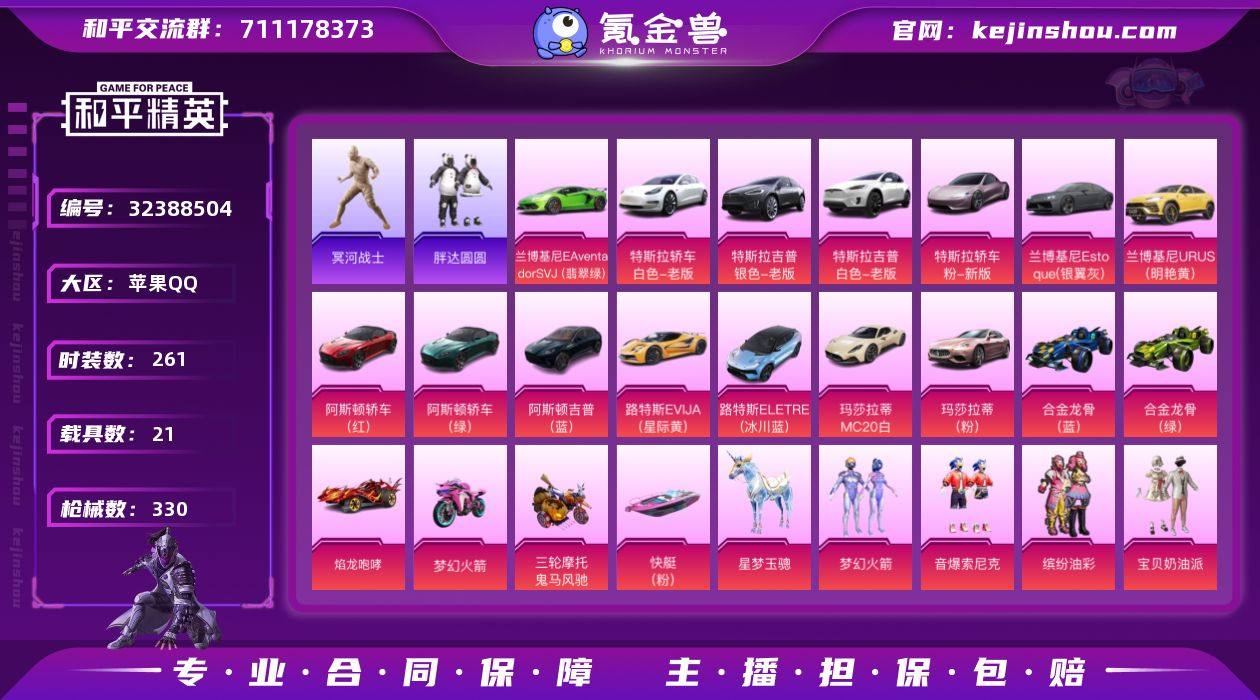 J2640 精品载具号 17粉 14特 21载具 冥河战士 宝贝奶油派 天使彩虹糖 梦幻火箭 甜蜜誓约 诡面斩 缤纷油彩 极致幻想 心之恋语 俏皮狐尾 洛天依 碧影闪光 橘柚倾心 音爆索尼克 樱桃泡泡 绯穹魔姬 狂魅哈莉 星穹咏叹调 满级风花雪月 苹果 手Q-17粉装-14特效枪-21载具-9粉色飞行器-139218热力值-17王牌印记-261套装-330枪皮 【热门品类】:粉装-梦幻火箭,粉装-音爆索尼克,粉装-缤纷油彩,套装-冥河战士,套装-胖达圆圆,套装-浪漫波比,套装-粉红小猪 【粉色套装】:粉装-宝贝奶油派,粉装-天使彩虹糖,粉装-梦幻火箭,粉装-缤纷油彩,粉装-甜蜜誓约,粉装-心之恋语,粉装-极致幻想,粉装-诡面斩,粉装-俏皮狐尾,角色-洛天依,粉装-碧影闪光,粉装-橘柚倾心,粉装-音爆索尼克,角色-樱桃泡泡,粉装-星穹咏叹调,角色-狂魅哈莉,角色-绯穹魔姬 【粉色枪皮等级】:AKM-甜心宝贝(五级),M416-风花雪月(七级),GROZA-香水柠檬(六级),ACE32-萌骑漫游(三级),Vector-绯穹魔姬(七级),AKS-74U-星穹咏叹调(六级),AKS-74U-森灵之息(四级),Kar98K-巳巳如意(五级),Mk14-福马献瑞(五级),DP-28-千金淑猫(五级),DP-28-豹影疾电(五级),MG3-洛神天依(四级),PKM-天星战神(三级),燃烧瓶...