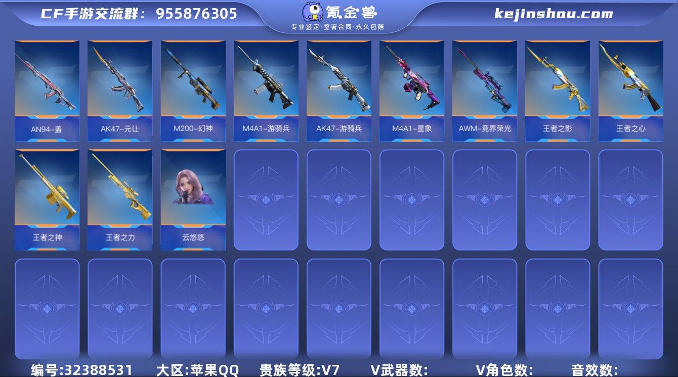 苹果Q☝贵族7☝云悠悠☝王者之力☝M4A1-星象☝AK47-元让☝AWM-竞界荣光☝M4A1-游骑兵一航轩☝AN94-盖☝王者之心☝王者之影☝王者之神-冰霜奇迹☝AK47-游骑兵-紫魇☝M200-幻神☝王者之狱☝COP 357-雷霆☝详细见图☝