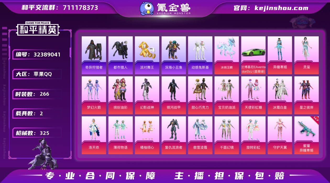 精品号 20粉14特2载具 派对舞王 都市猎人 红熊茄茄 猪妹 甜心巧克力 梦幻火箭 满级五爪 冰马 苹果 手Q-20粉装-14特效枪-2载具-6粉色飞行器-117910热力值-15王牌印记-266套装-325枪皮 【热门品类】:粉装-梦幻火箭,粉装-缤纷油彩,套装-浪漫天命,套装-都市猎人,套装-派对舞王,套装-深海小丑鱼,套装-奇异狩猎者,角色-军刀雅典娜,套装-动感兔斯基人偶服,套装-AG战队服,套装-龟仙人,套装-潮萌小黄鸭,套装-暗影哥特,套装-浪漫波比,套装-萌熊伴侣,角色-8号机,角色-Mark.06,套装-红熊茄茄 【粉色套装】:粉装-幻影战神,粉装-银河战甲,粉装-甜心巧克力,粉装-宝贝奶油派,粉装-天使彩虹糖,粉装-梦幻火箭,粉装-缤纷油彩,粉装-冰霜白皇,粉装-星之彼岸,角色-洛天依,粉装-薄荷物语,粉装-橘柚倾心,角色-复仇流浪者,粉装-傲雪凌霜,粉装-千面幻镜,粉装-旋转彩虹,角色-守护天翼,角色-灵玺,角色-异瞳寒姬,角色-罪夜之冕 【粉色枪皮等级】:AKM-暮色玫影(三级),SCAR-L-锦绣绵绵(五级),M416-五爪金龙(七级),AUG-罪夜之冕(四级),蜜獾-异瞳寒姬(七级),ACE32-萌骑漫游(五级),UZI-筑梦精灵(六级),Vector-环太平洋(七级),AKS-74U-森灵之息(五级),Kar98K-创...