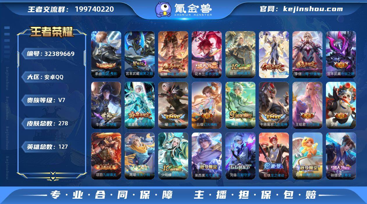 【高性价比·李逍遥·白虎志·愿照九州拓·逐花归海·电玩雷克斯·冠军飞将·绛天战甲·猫影幻舞·可二次】w19741-安卓Q-127英雄-171皮肤-7王者印记-170铭文-贵族积分2w【贵族7】【1星传说·11传说·2按键】【因赛季更新游戏段付以上号为准!】 【英雄全皮】:影全皮 【星元皮肤】:宫本武藏幽冥之眼 【传说皮肤】:澜愿照九州拓,澜逐花归海,澜电玩雷克斯,曜李逍遥 ,铠绛天战甲,貂蝉猫影幻舞,百里玄策白虎志,花木兰冠军飞将,梦奇胖达荣荣,宫本武藏地狱之眼,孙悟空地狱火 【限定皮肤】:白起狰,狄仁杰阴阳师,赵云皇家上将,嬴政白昼王子,高渐离玩趣恶龙,芈月重明,吕布猎兽之王,元歌云间偶戏,夏侯惇朔风刀,曹操烛龙,典韦穷奇,狄仁杰魔术师,狄仁杰万华元夜,达摩沙漠行僧,项羽海滩派对,老夫子醍醐杖,程咬金演武夺筹,亚瑟潮玩骑士王,孙悟空美猴王,孙悟空至尊宝,孙悟空大圣娶亲,牛魔御旌,李元芳云中旅人,钟馗驱傩正仪,太乙真人饕餮,鬼谷子原初探秘者,鬼谷子五谷丰年,百里玄策白虎志,弈星混沌棋,公孙离蜜橘之夏,明世隐疑决卦,裴擒虎李小龙,裴擒虎擒涛扼浪,狂铁御狮,米莱狄御霄,云中君纤云弄巧,盾山御銮,曜李逍遥 ,鲁班大师探海日志,桑启海盐诗旅...