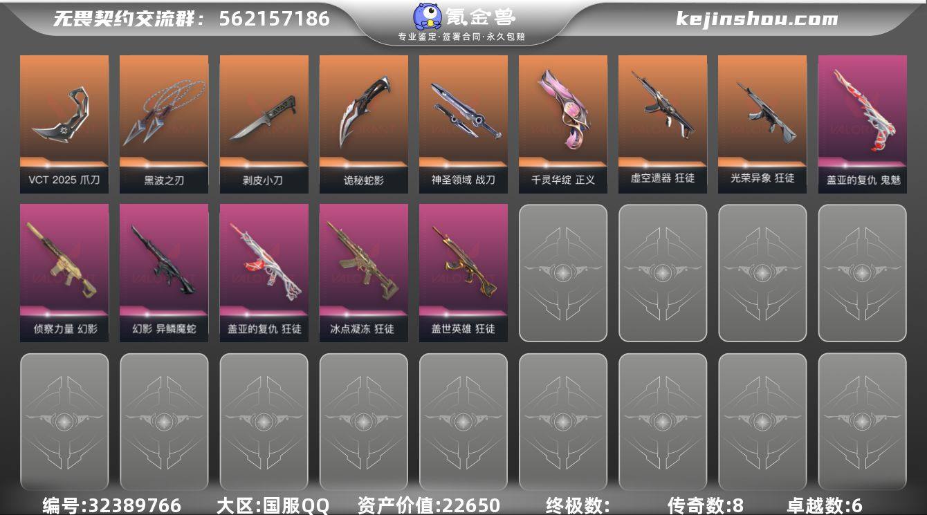 段位: 钻石 套装: VCTCN2025套装,VCT 2025赛季礼包 近战武器皮肤: 剥皮小刀-异形猎人,黑波之刃-塑水宗,神圣领域 战刀,VCT 2025 爪刀,诡秘蛇影 步枪皮肤: 狂徒-盖亚的复仇,幻影-侦察力量,狂徒-冰点凝冻,狂徒-盖世英雄,幻影-异鳞魔蛇,狂徒-虚空遗器,狂徒-光荣异象 佩枪皮肤: 鬼魅-盖亚的复仇,正义-千灵华绽 亮点: 【优质装备】:狂徒-盖亚的复仇,幻影-侦察力量,正义-千灵华绽,鬼魅-盖亚的复仇,狂徒-冰点凝冻,狂徒-盖世英雄,剥皮小刀,黑波之刃,神圣领域 战刀,VCT 2025 爪刀,诡秘蛇影