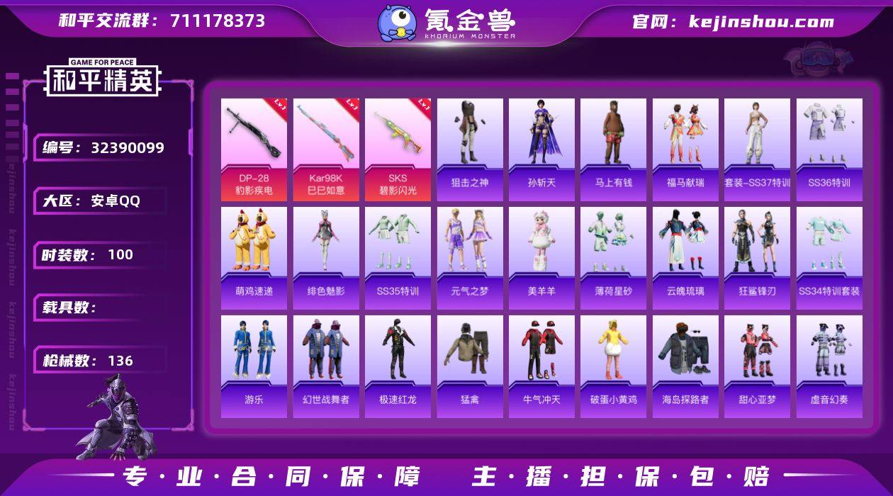 【特价出售/店主推荐】安卓 手Q-1粉装-4特效枪-0载具-0粉色飞行器-18493热力值-3王牌印记-42套装-72枪皮 【粉色套装】:粉装-飒粉甜心 【粉色枪皮等级】:UMP45-萌骑冒险(二级),AKS-74U-森灵之息(四级),Mk14-福马献瑞(五级),DP-28-豹影疾电(五级) 【粉色枪皮】:UMP45-萌骑冒险,AKS-74U-森灵之息,Mk14-福马献瑞,DP-28-豹影疾电 【粉色降落伞】:垂柳戏鸭降落伞 【稀有套装】:套装-马上有钱,套装-雨过天青,套装-红釉青花,角色-霜纹水星,角色-曹焱兵 【稀有枪皮】:AKM-彩虹符号,AKM-破晓战魂,AKM-龙的传人,M16A4-幻世战舞者,SCAR-L-玉兔迎春,SCAR-L-红色方程式,M416-糯团青竹,M416-蓝色火焰,GROZA-田园牧歌,AUG-耀粉歌者,AC-VAL-天降萌叽,蜜獾-天降萌叽,蜜獾-娇憨猪猪,蜜獾-虎痴许褚,UZI-娇憨猪猪,UZI-红色方程式,UMP45-涂山之恋,UMP45-生命誓言,UMP45-蓝色火焰,Vector-彩虹符号,Vector-生命誓言,Vector-田园牧歌,汤姆逊-天降萌叽,汤姆逊-耀粉歌者,P90-飞驰魅影,Kar98K-王子的夏天,Kar98K-红色方程式,SKS-糯团青竹,VSS-田园牧歌,Mini14-炫彩节奏,Mini14-耀粉歌者,SLR-娇憨猪猪,S686-红色方程式,S1897-炫彩节奏,S12K-玩趣呆呆,S12K-破晓战魂,S12K-娇憨猪猪,SPAS-12-田园牧歌,M249-妙红点点,M249-彩虹符号,M249-破晓战魂,DP-28-彩虹符号,DP-28-旋转彩虹,MG3-幻世战舞者 【其他套装】:套装-SS19特训,套装-SS20特训,套装-SS21特训,套装-SS22特训,套装-SS25特训,套装-光之冒险,套装-幻世战舞者,套装-探宝勇士,套装-极速红龙,套装-涂山之恋,套装-潮流炫酷,套装-牛气冲天,套装-玉兔迎春,套装-甜蜜告白,套装-白色伏地魔,套装-破晓战魂,套装-破蛋小黄鸡,套装-竞技名士,套装-长空猛禽,套装-飞行日记,套装-魅力单车,套装-麻辣教官,套装-冰川特...